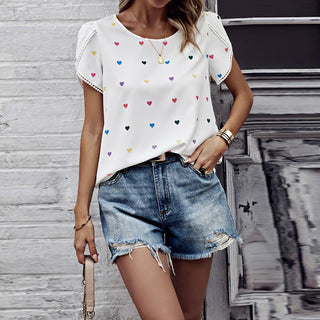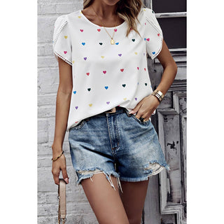 Introducing the Heartfelt Harmony Top, a delightful blend of style and comfort. This top features a round neck, short petal sleeves with trim, and a button back closure for easy wear. The round hem and relaxed easy fit make it perfect for any casual outing. Adorned with a colorful hearts pattern woven fabric, this top adds a playful touch to your wardrobe.