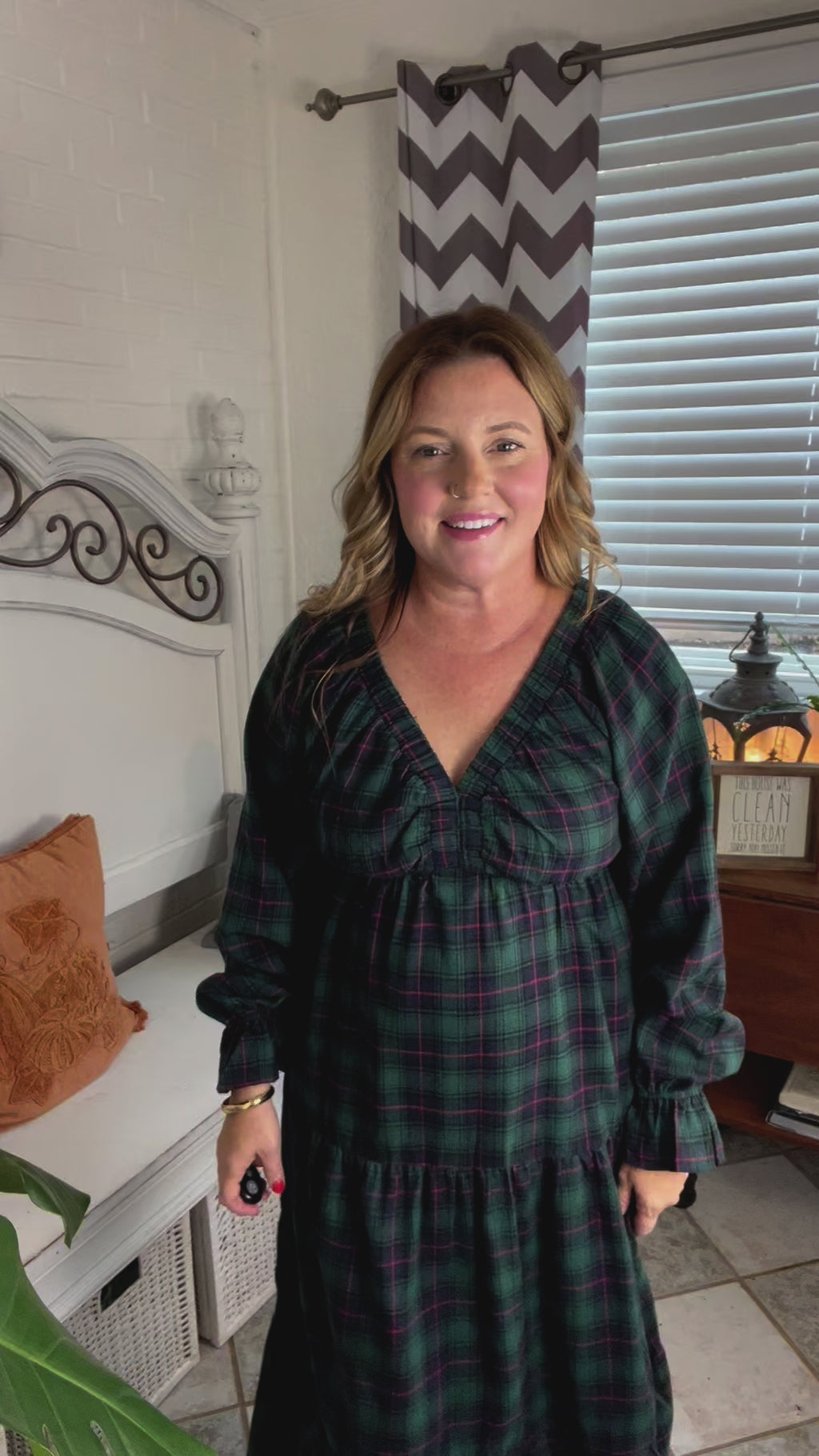 You will love this plaid elastic V neck flutter sleeve maxi featuring a flattering tiered ruffle hemline. Stylish and versatile, this stylish maxi is perfect for all your holiday festivities.