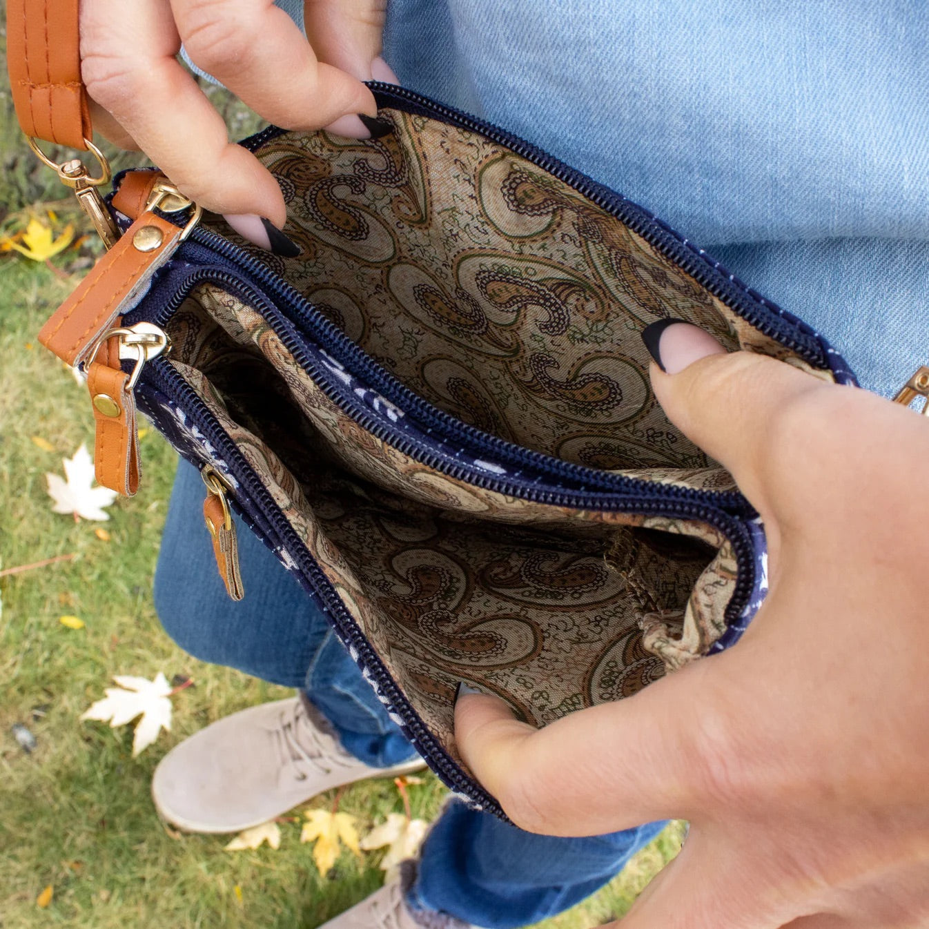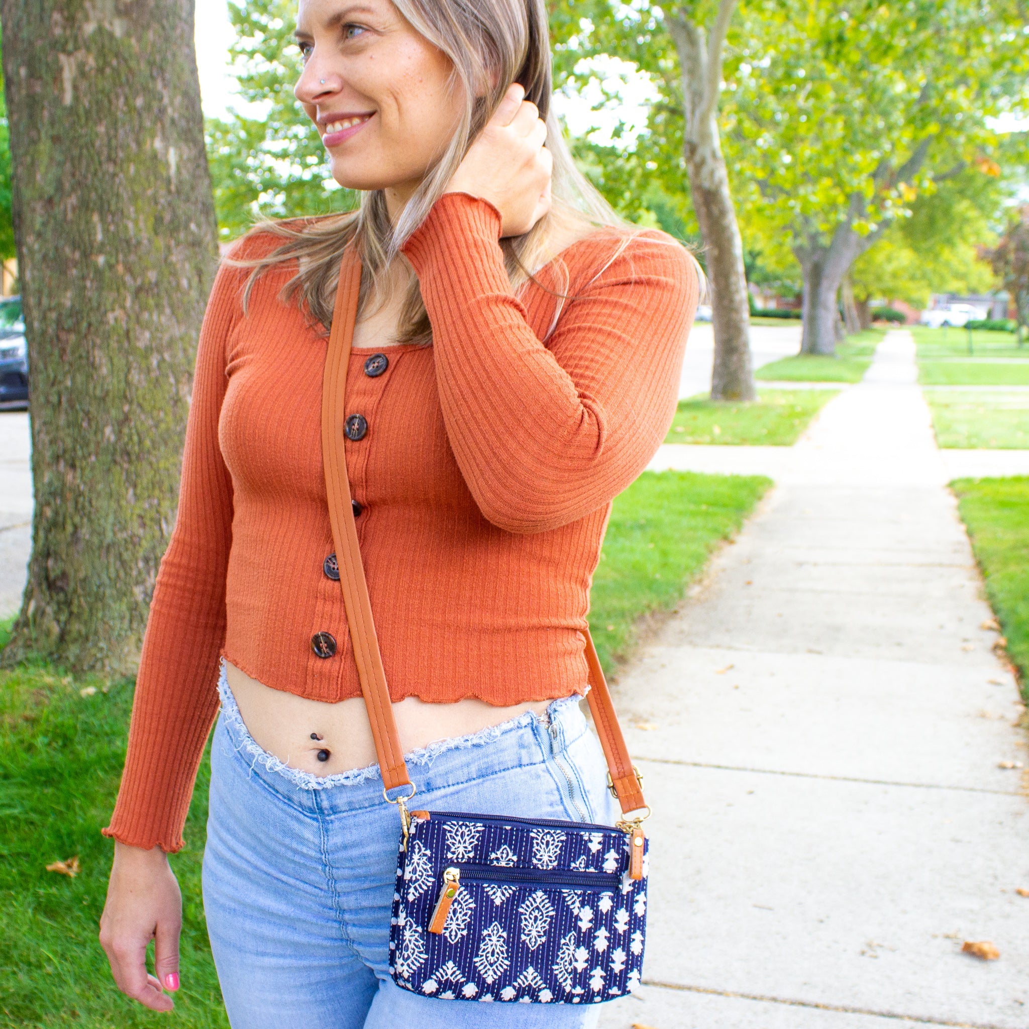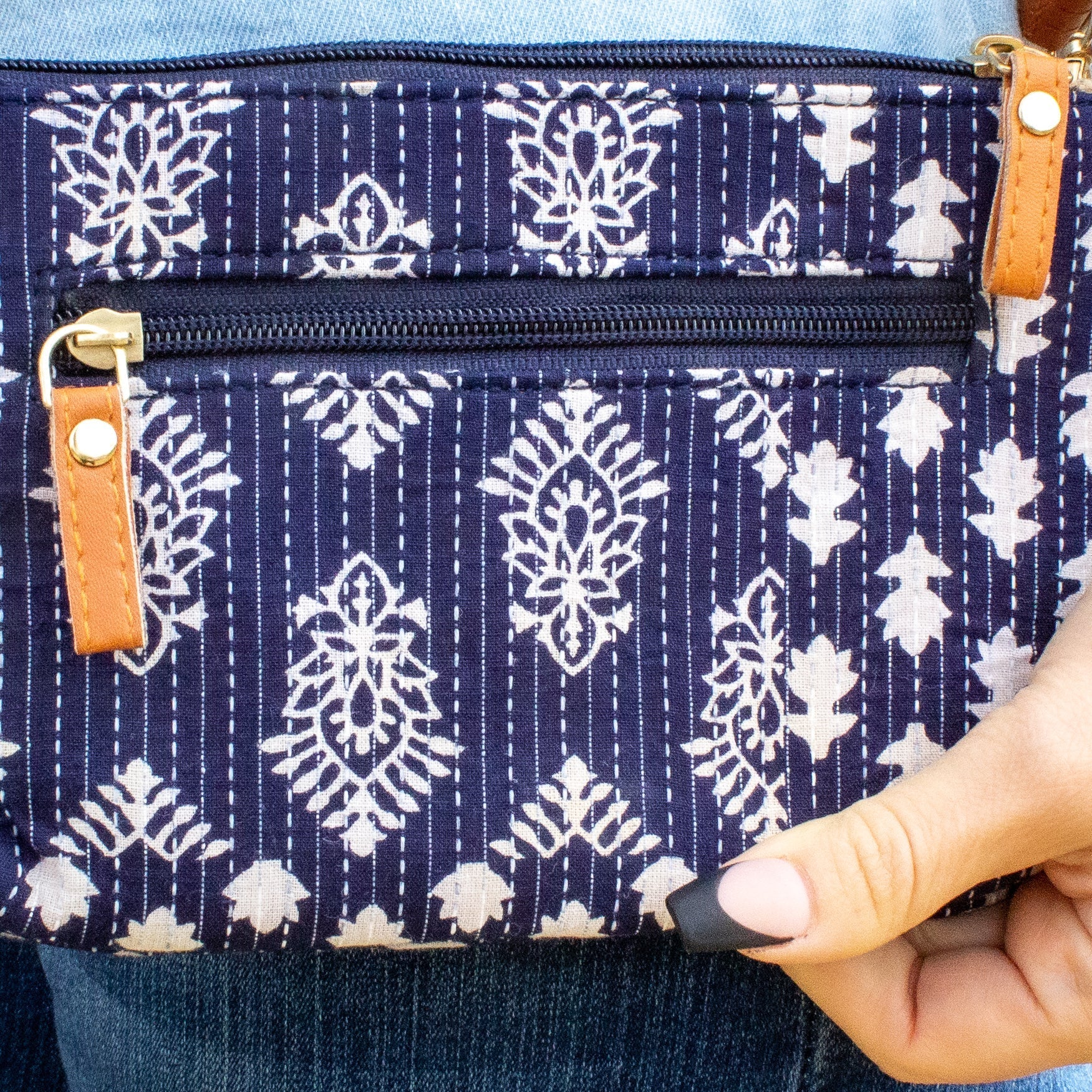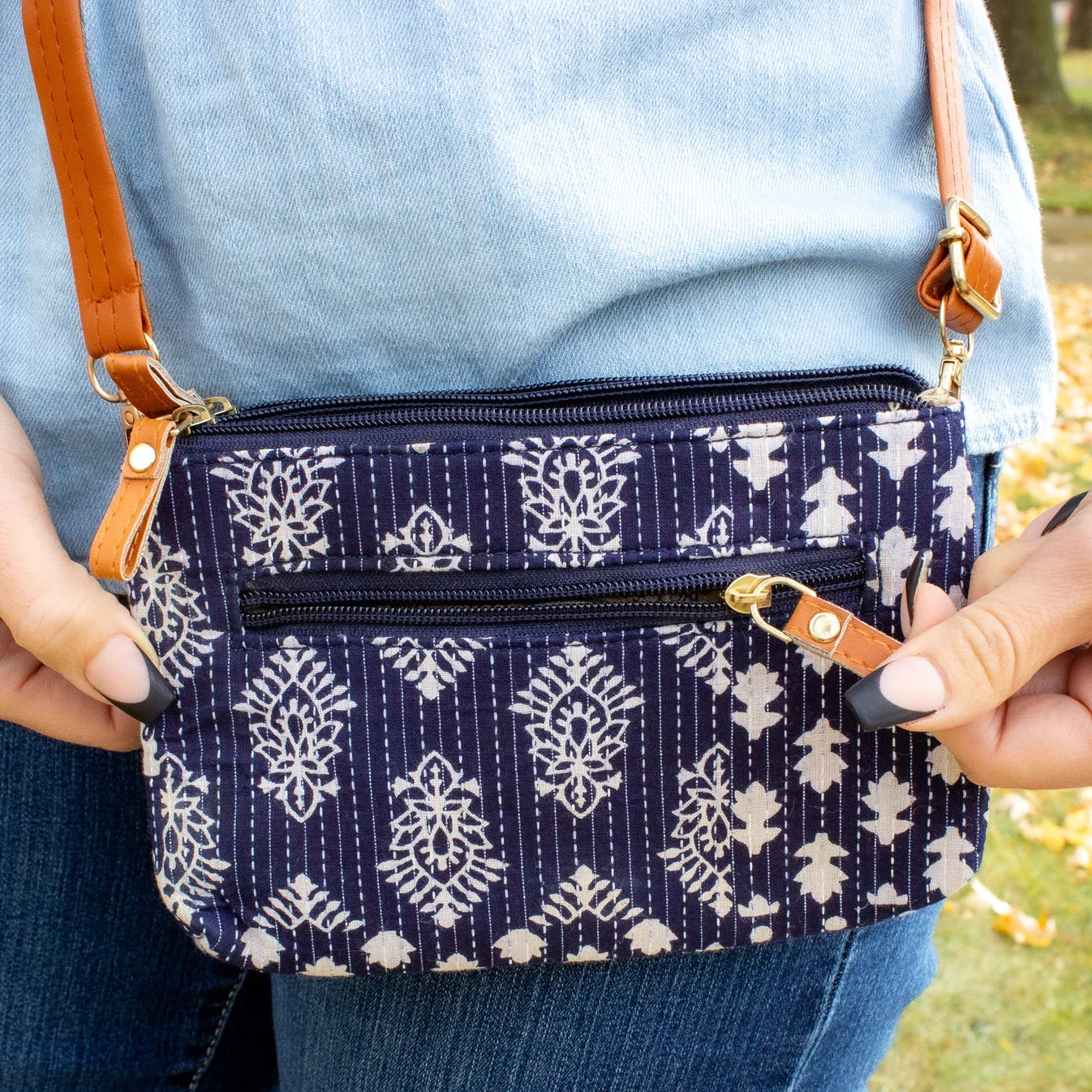 This contemporary crossbody with a subtle bohemian punch is a chic essential. Just the right size for casual nights out - and separate zipper compartments for your phone and wallet! Features printed tribal pattern and a handy side compartment. Handcrafted by artisans in India, you'll empower women AND stand out in the crowd with this adorable statement piece. Quickly transform it into a clutch by removing the strap!