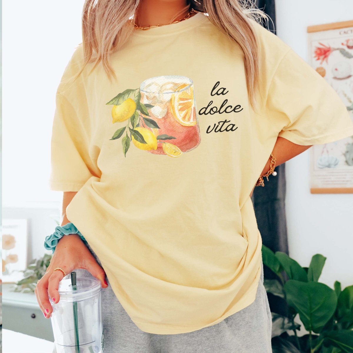 The tee boasts a chic graphic that embodies "La Dolce Vita," or "the sweet life," with elegant typography and playful imagery that adds a dash of sophistication to your look.