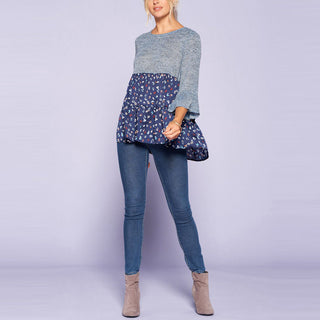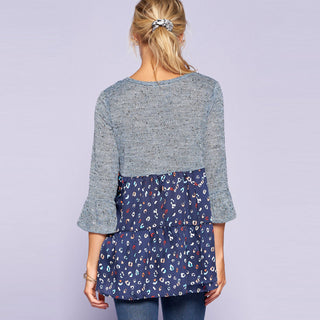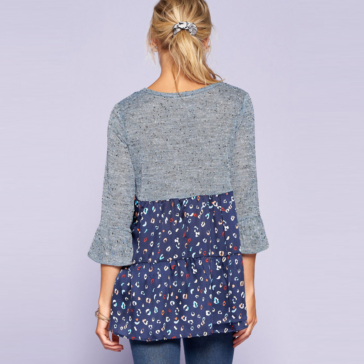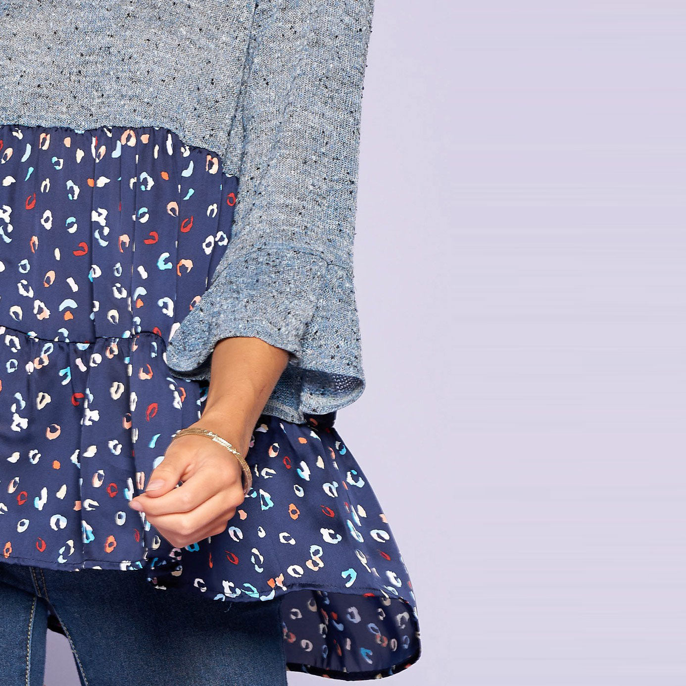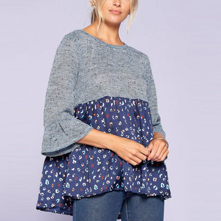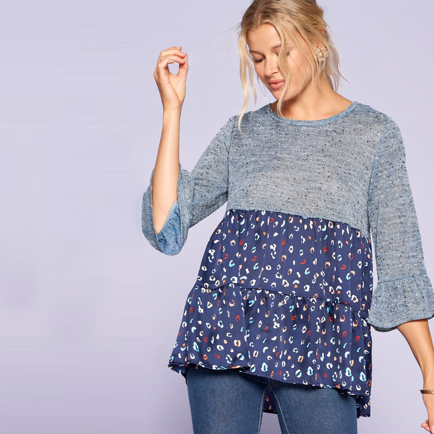 Round Neck. Knit Contrast with Stylist Print Tier. Flounce Sleeve. Relax & Flowy Fit. Soft Knit