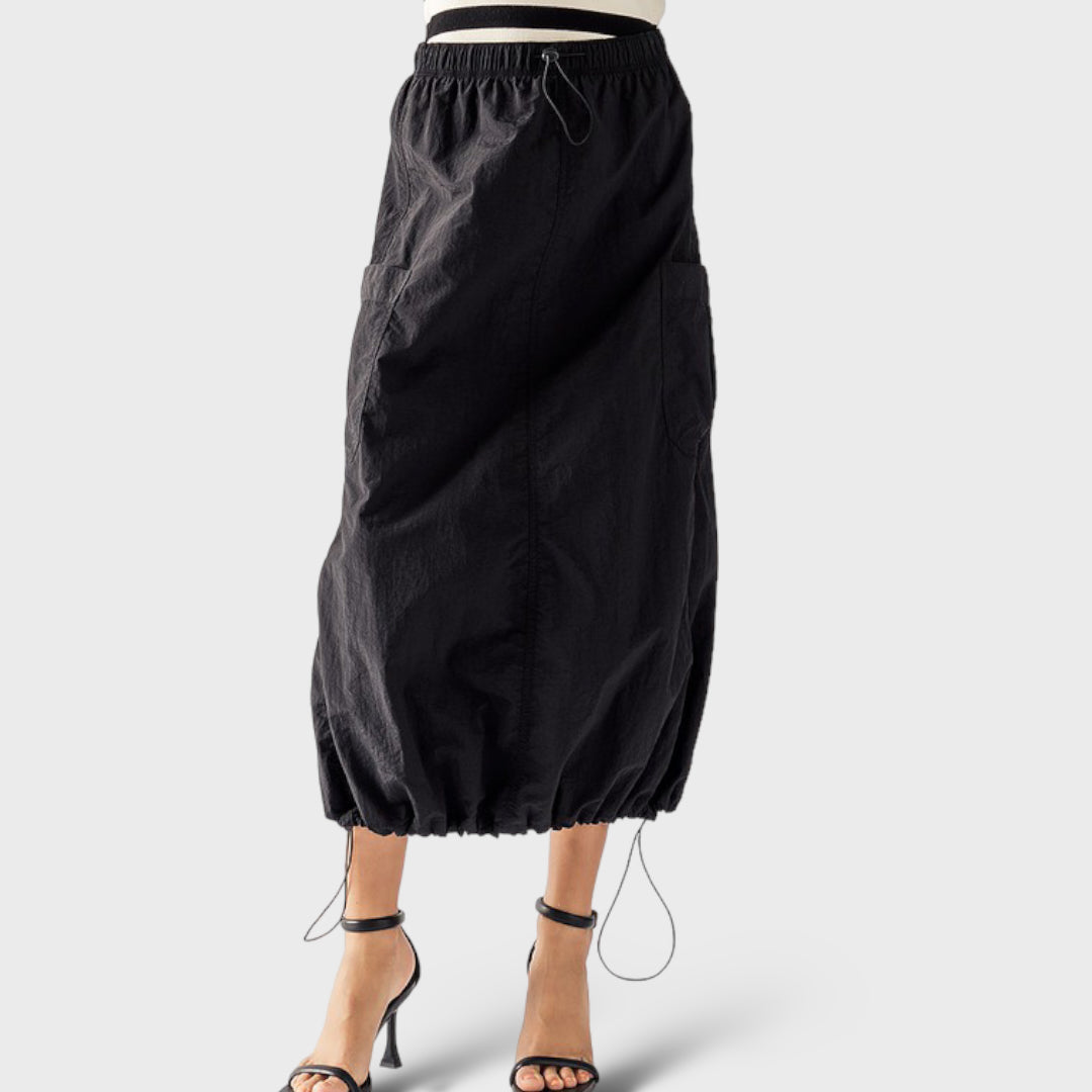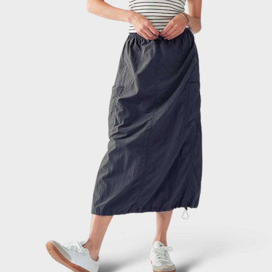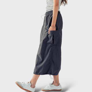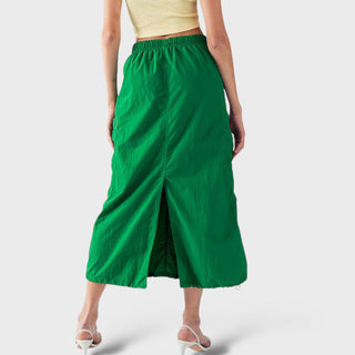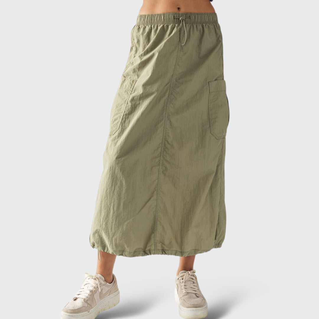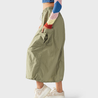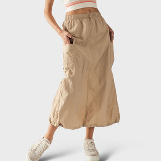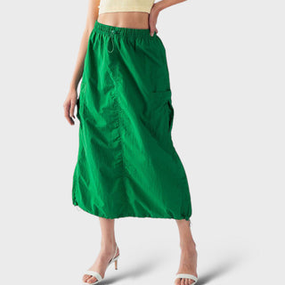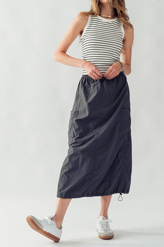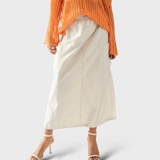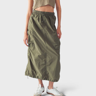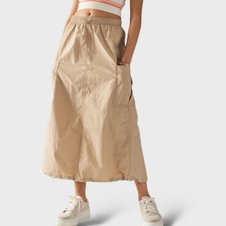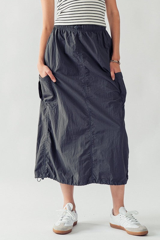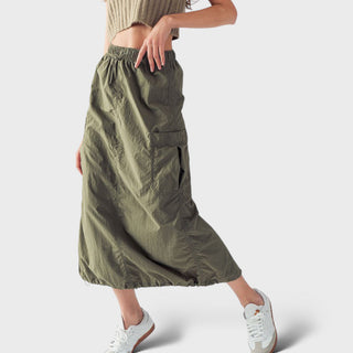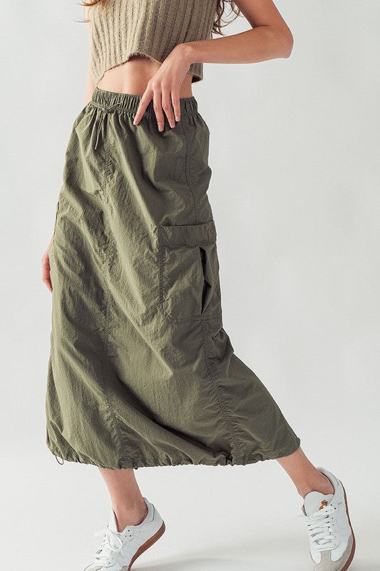The details from your favorite cargos paired with a long skirt silhouette! Cut with a high rise, an elasticated waistband, and a slit at the back. Complete with cargo pockets at the sides.