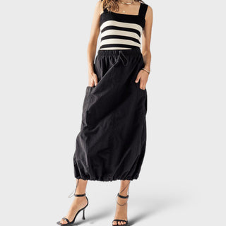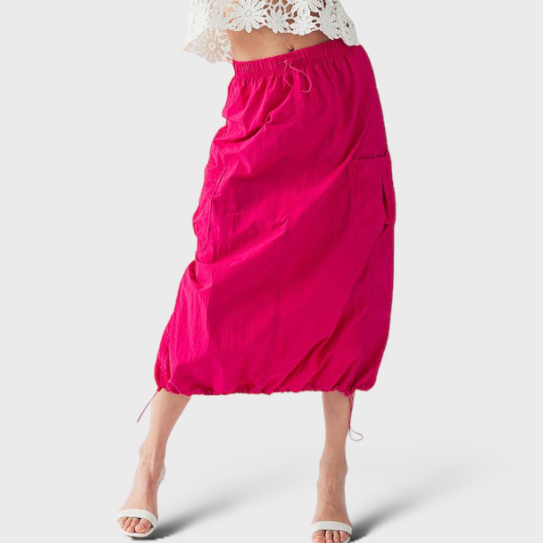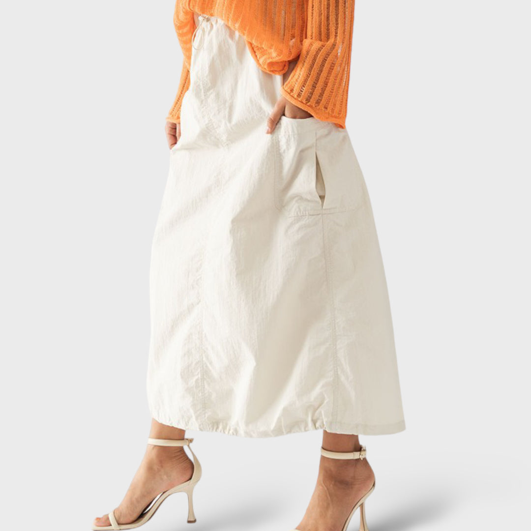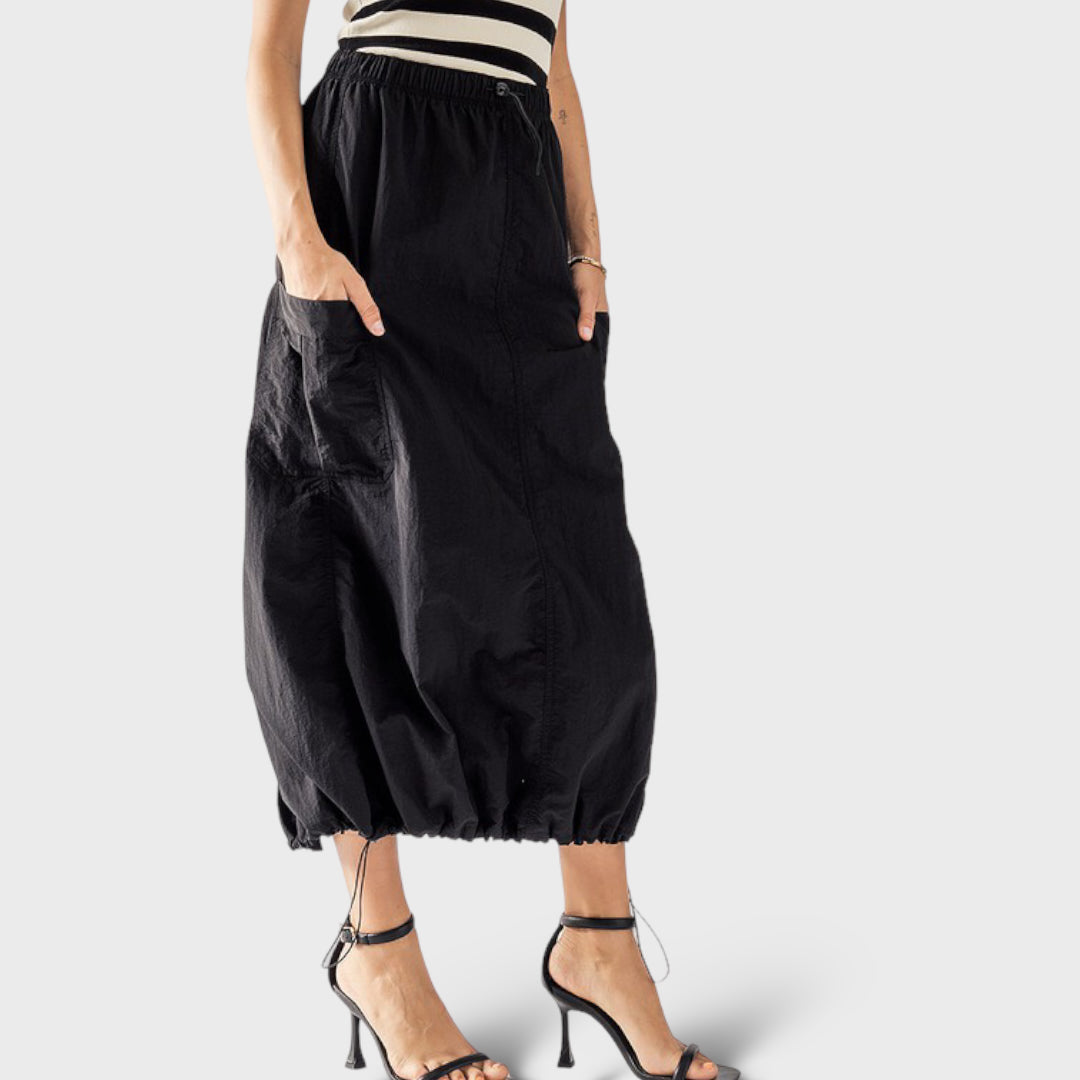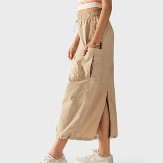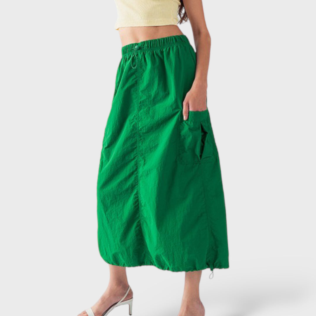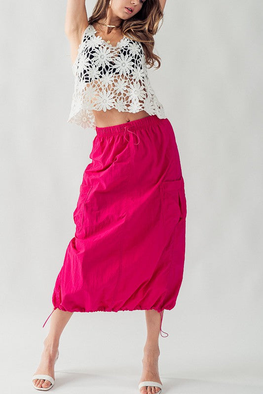 The details from your favorite cargos paired with a long skirt silhouette! Cut with a high rise, an elasticated waistband, and a slit at the back. Complete with cargo pockets at the sides.