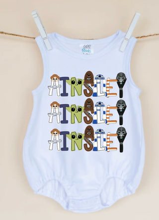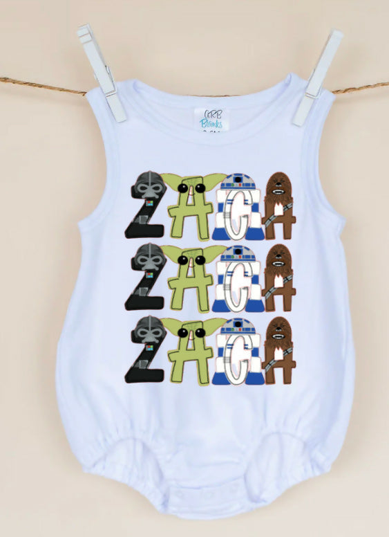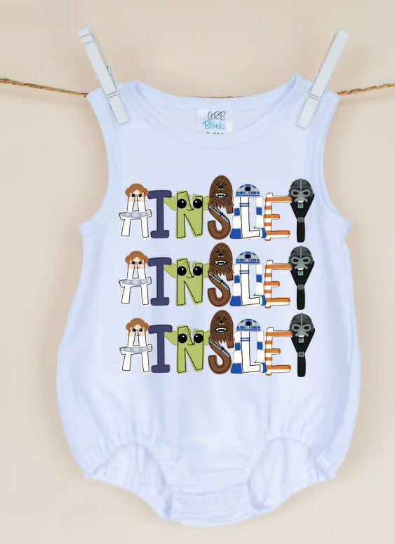 The bubbles are a super soft poly/cotton blend that have buttons at the shoulders and snaps at the crotch for easy changes. The design is dye sublimated onto the bubble and is machine washable.