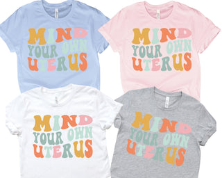 Mind Your Own Uterus. The design is dye sublimated onto a poly/cotton blend tee for the most vibrancy. The tee has a unisex, relaxed fit and runs true to size. Please see the size chart for exact measurements.