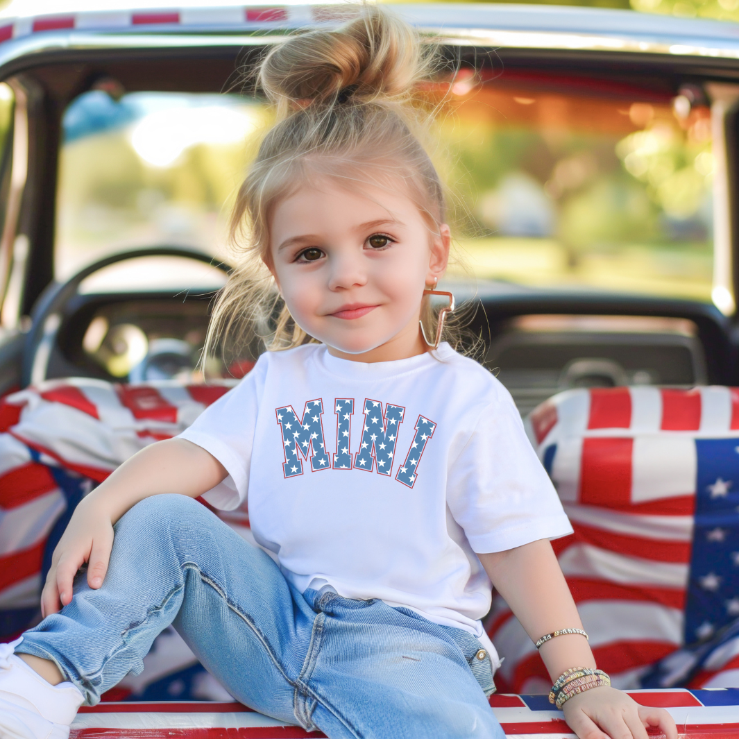 Get your little one ready for Independence Day with our "Mini" T-shirt. It's crafted for comfort and cuteness, making it perfect for your toddler to enjoy the 4th of July celebrations.
