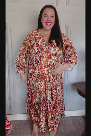 You will love this satin floral print elastic V neck flutter sleeve maxi featuring a flattering tiered ruffle hemline. Stylish and versatile, this elegant maxi is perfect for all your holiday festivities.
