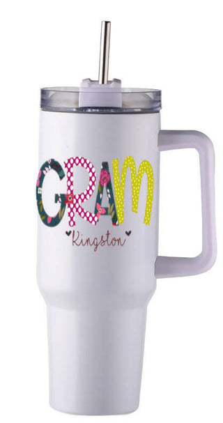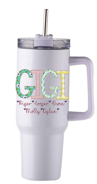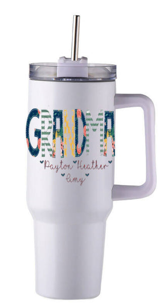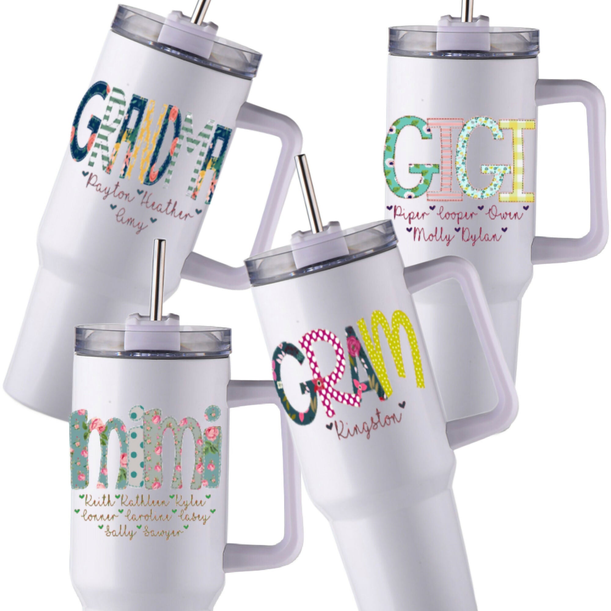 The personalization is dye sublimated onto the cup. It is suggested that you hand wash the tumbler to keep it bright and new looking. The "mom" name is designed in one of my Alphabet Soup Alphas of your choosing. The 'kids" names will have a heart in between each name.