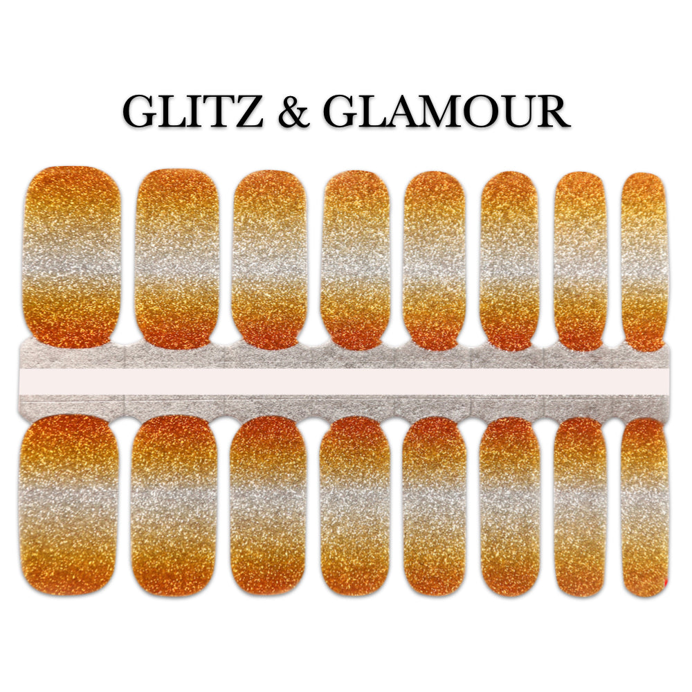 Get ready to sparkle and shine with our Glitz & Glamour Nail Wrap! With an ombré glitter effect that transitions from golden orange to sunny yellow to dazzling silver, your nails will be the talk of any event. Add some glam to your life with these playful and eye-catching nail wraps!