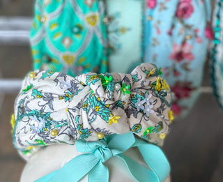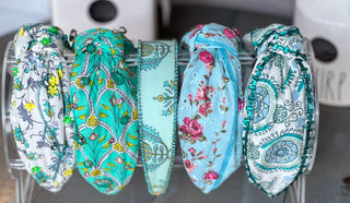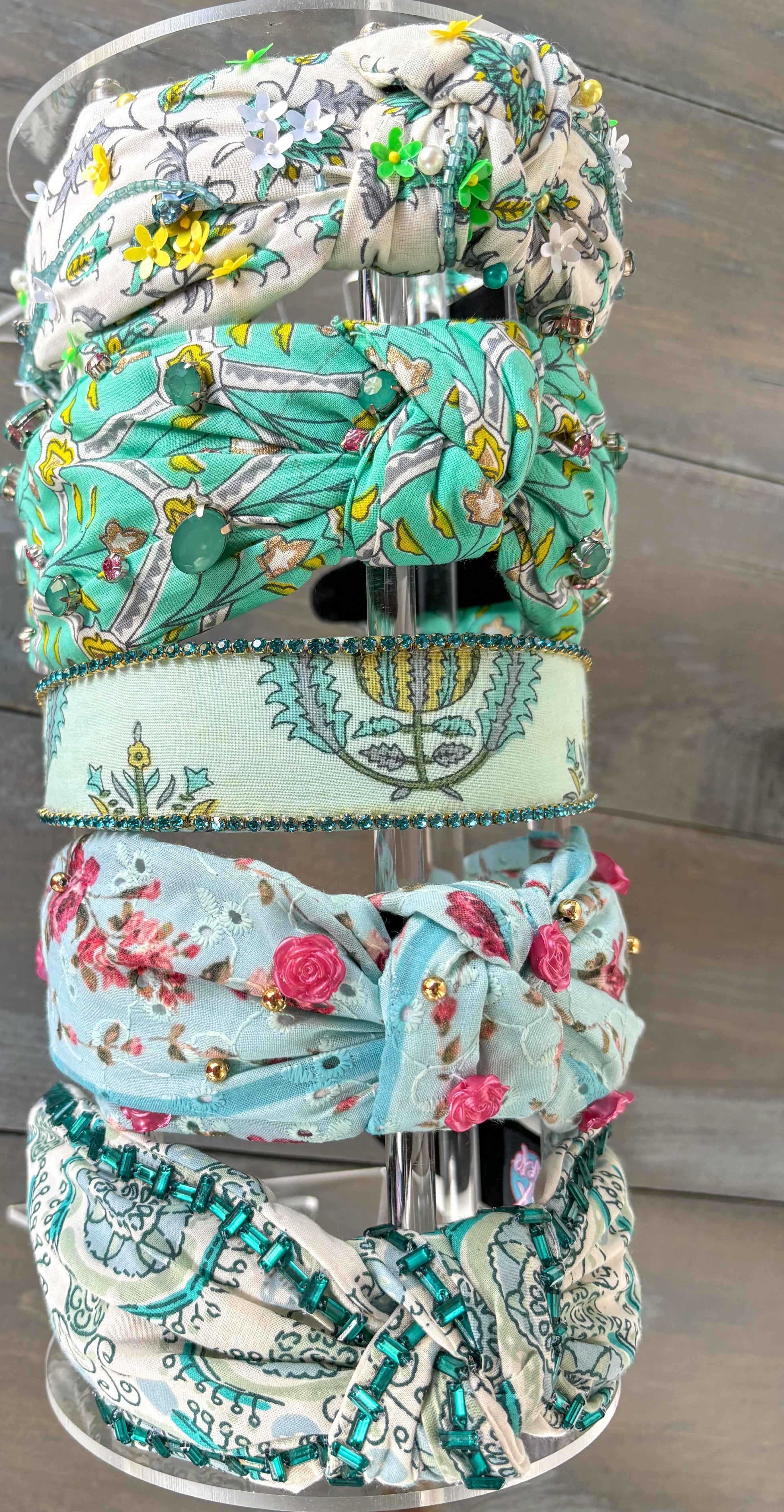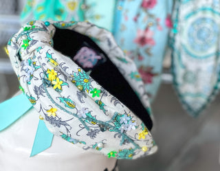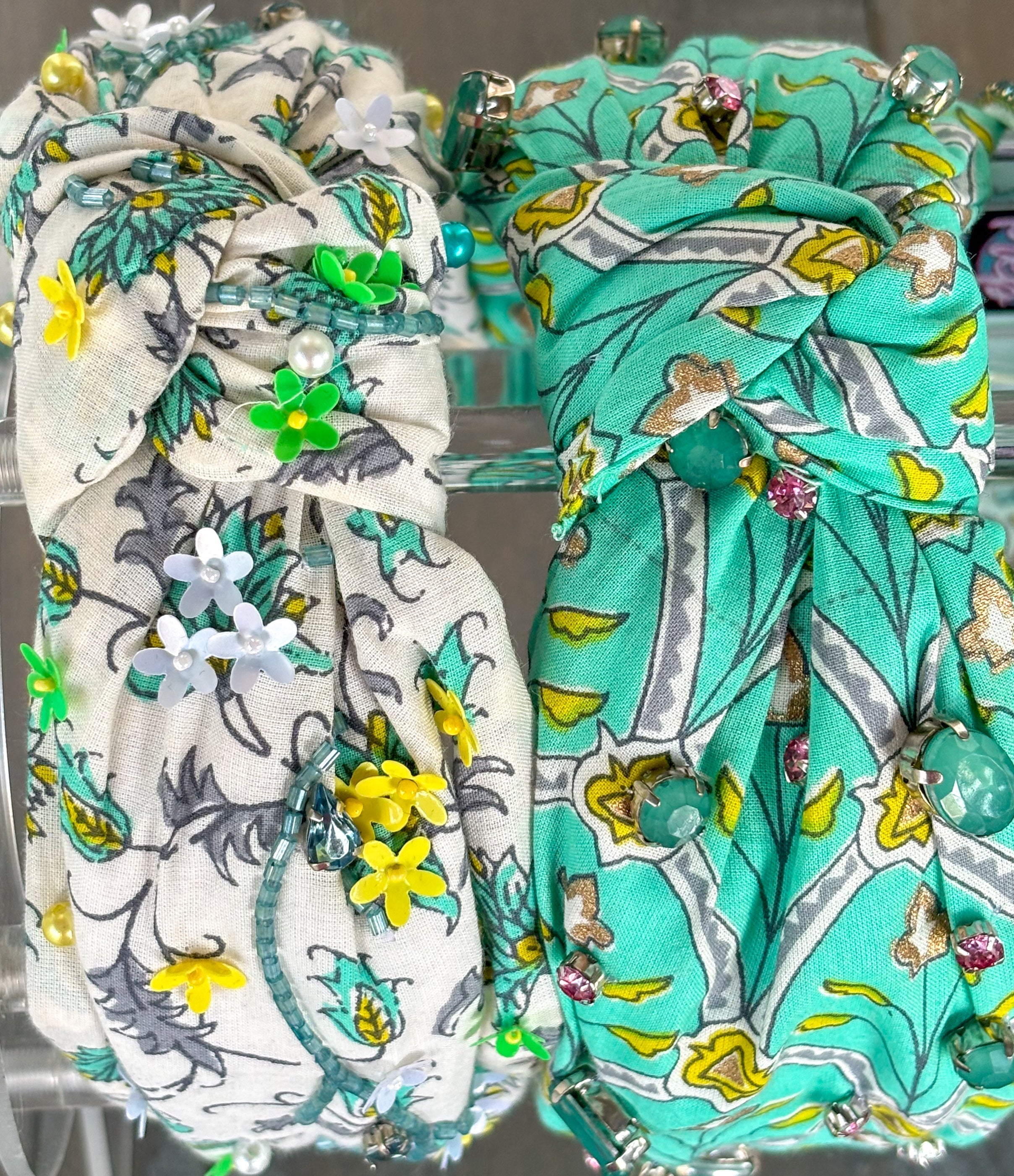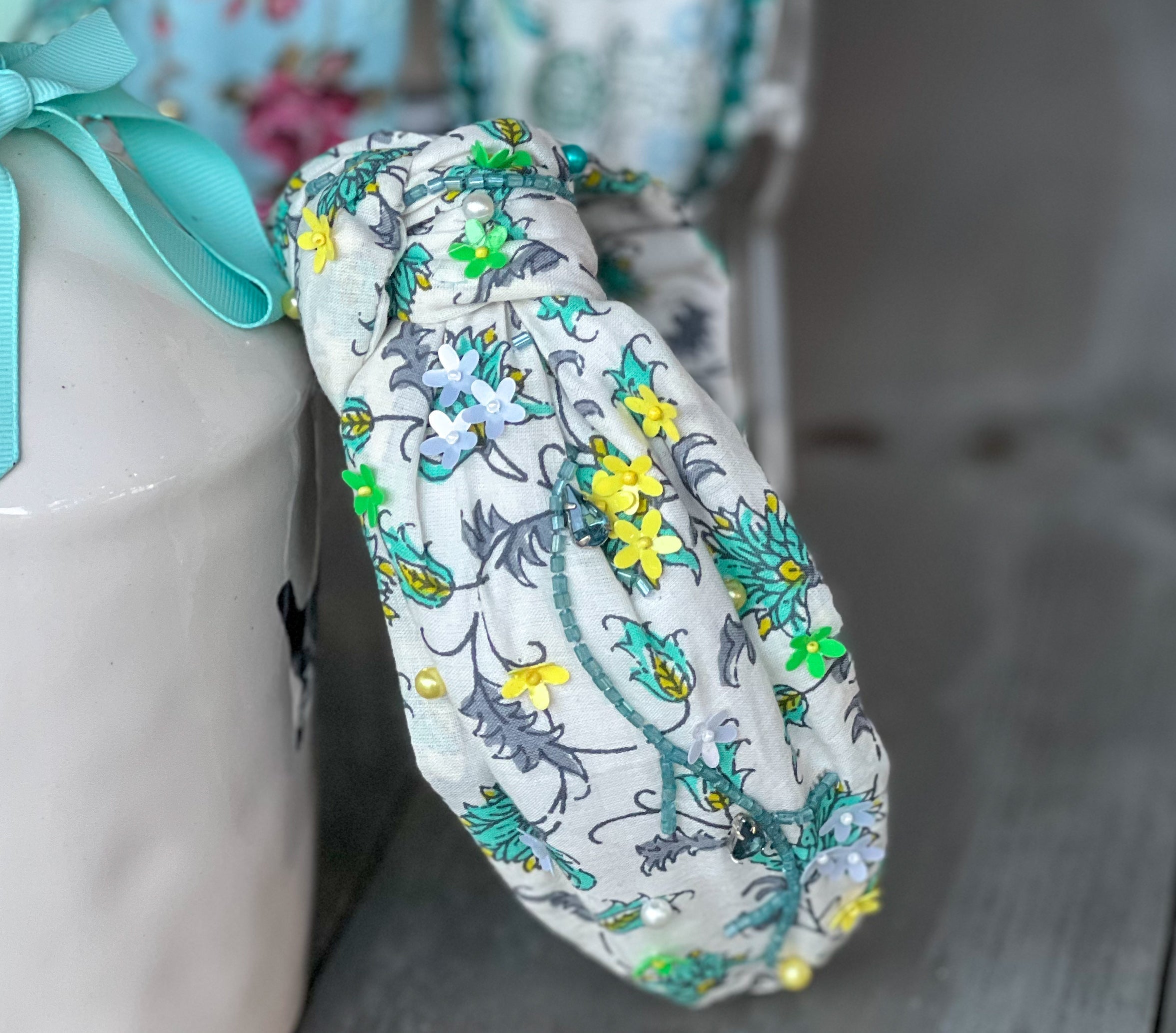 Elevate your Spring and Summer outfits with our exquisite handmade beaded headbands. Pair them with our intricate earrings and elegant purses for a flawless look. Our Carova headband boasts a beautiful top knot style, blending shades of blue, yellow and green in a floral pattern, highlighted by beaded details and sequin flowers. Meticulously handcrafted by our skilled team of jewelry experts. One size, measuring 1.5" in width.