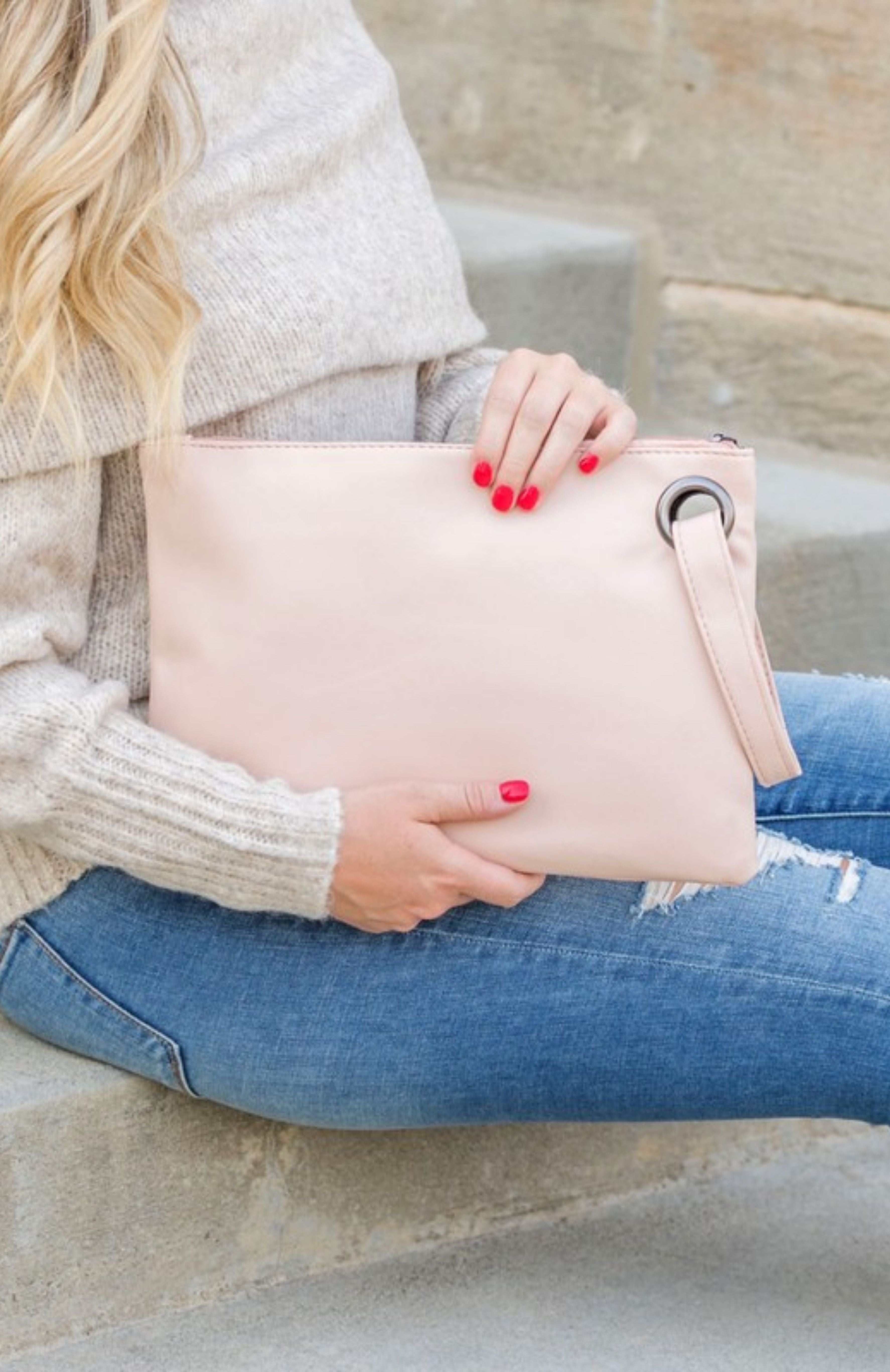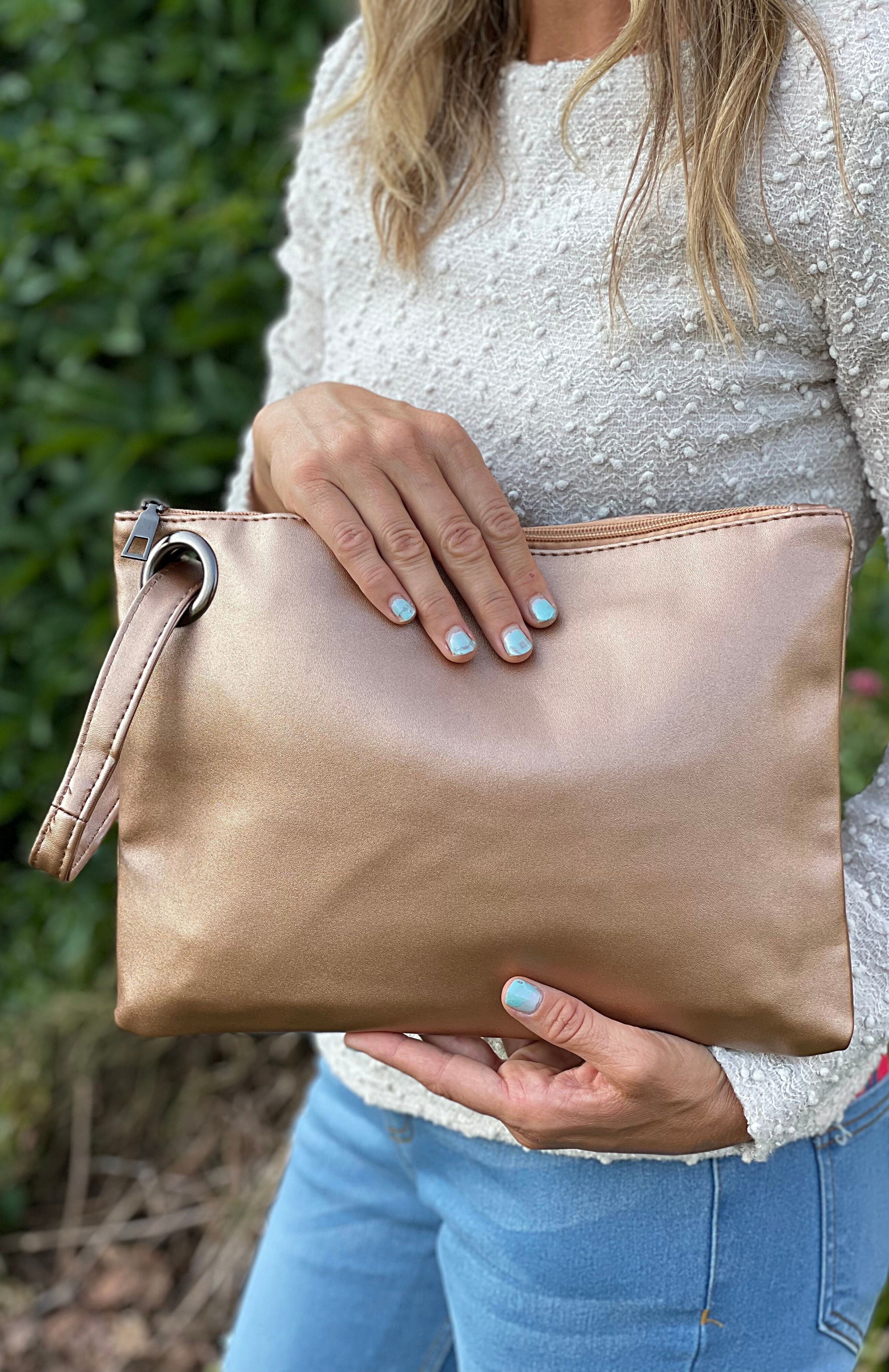 Soft Vegan PU leather exterior with 100% polyester full liningAttached wristlet for easy carrying Inside pockets: 1 zipper pocket, 2 additional openLarge grommet detail Measurements: 12" L x 8" W
