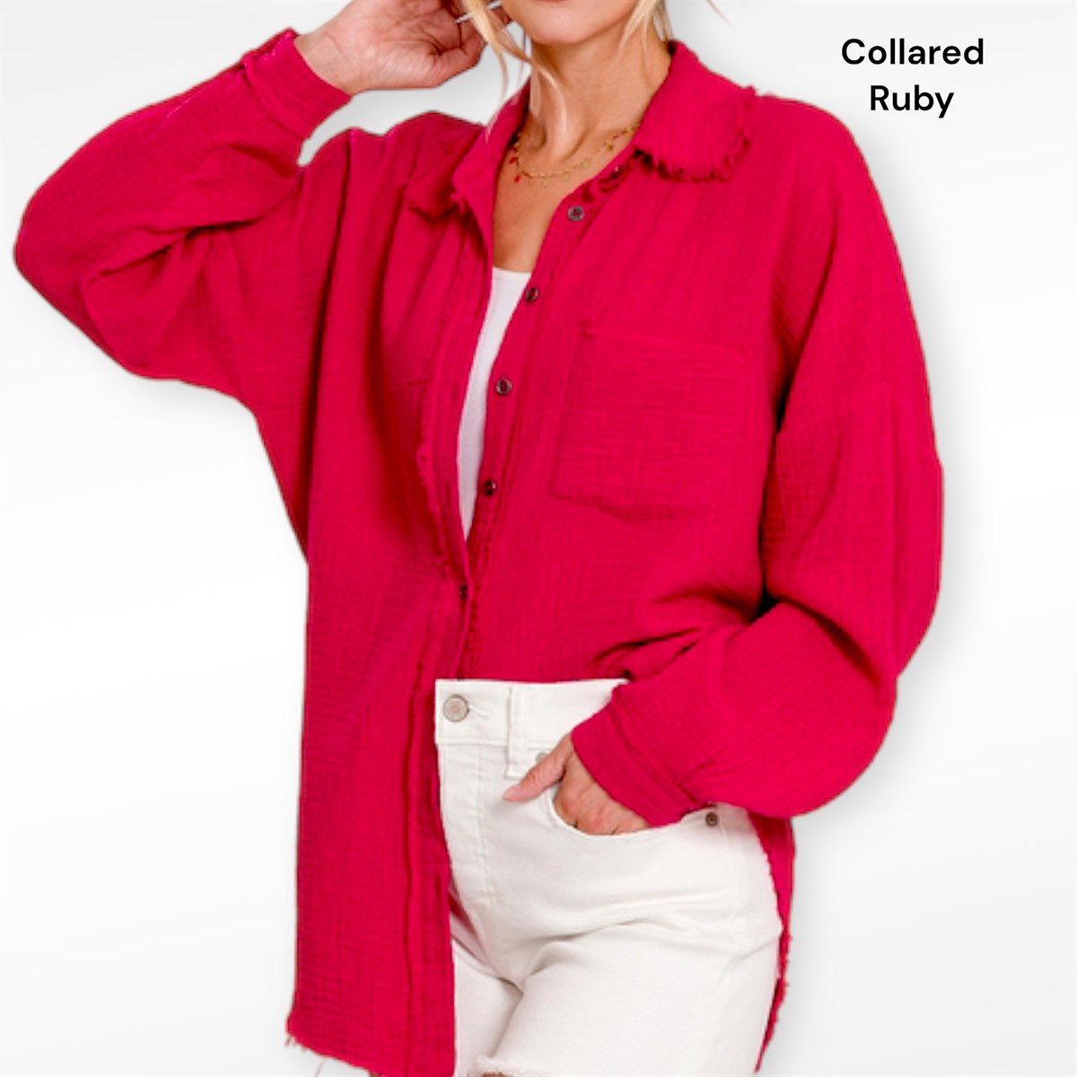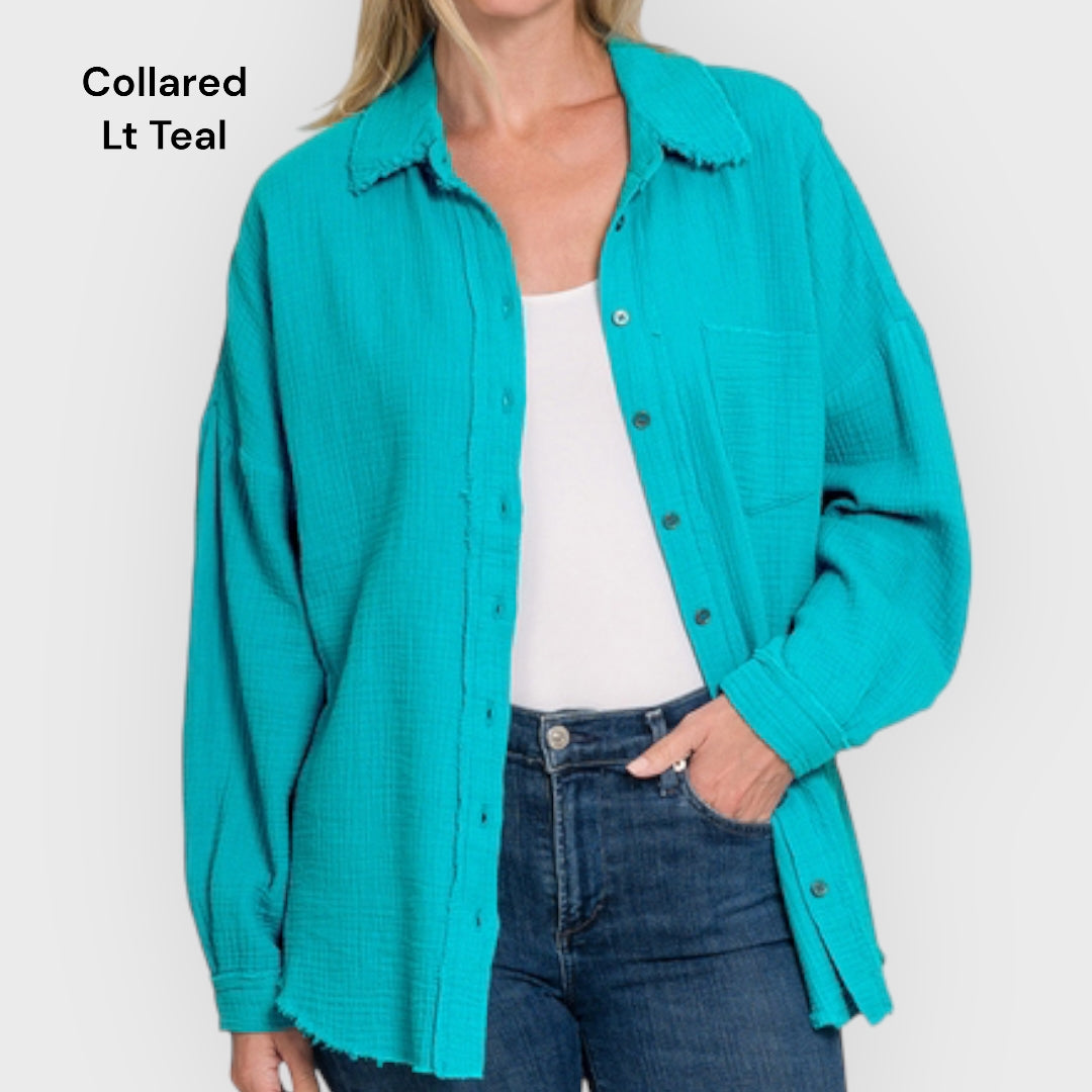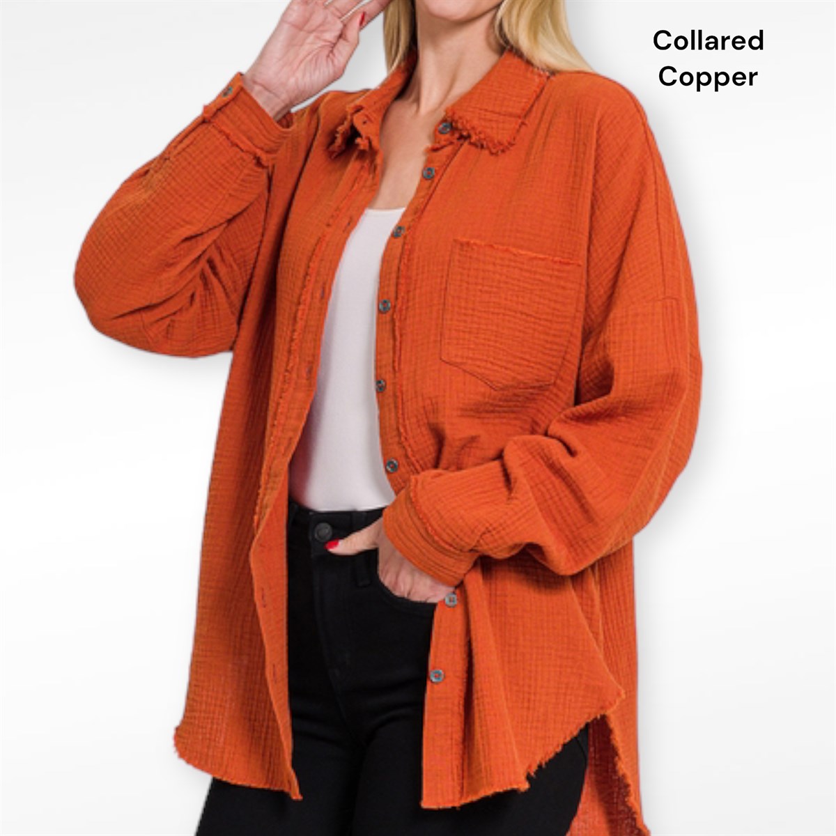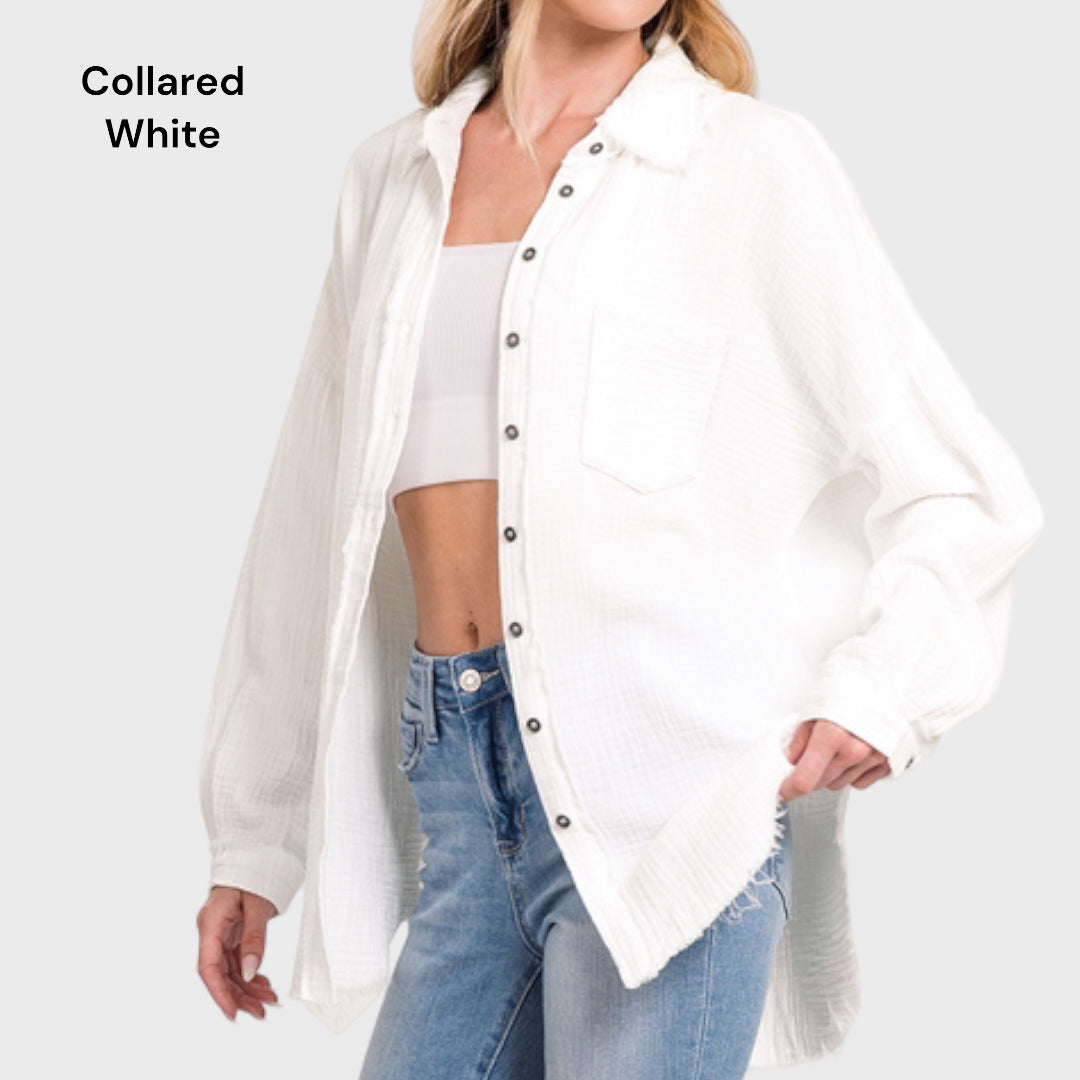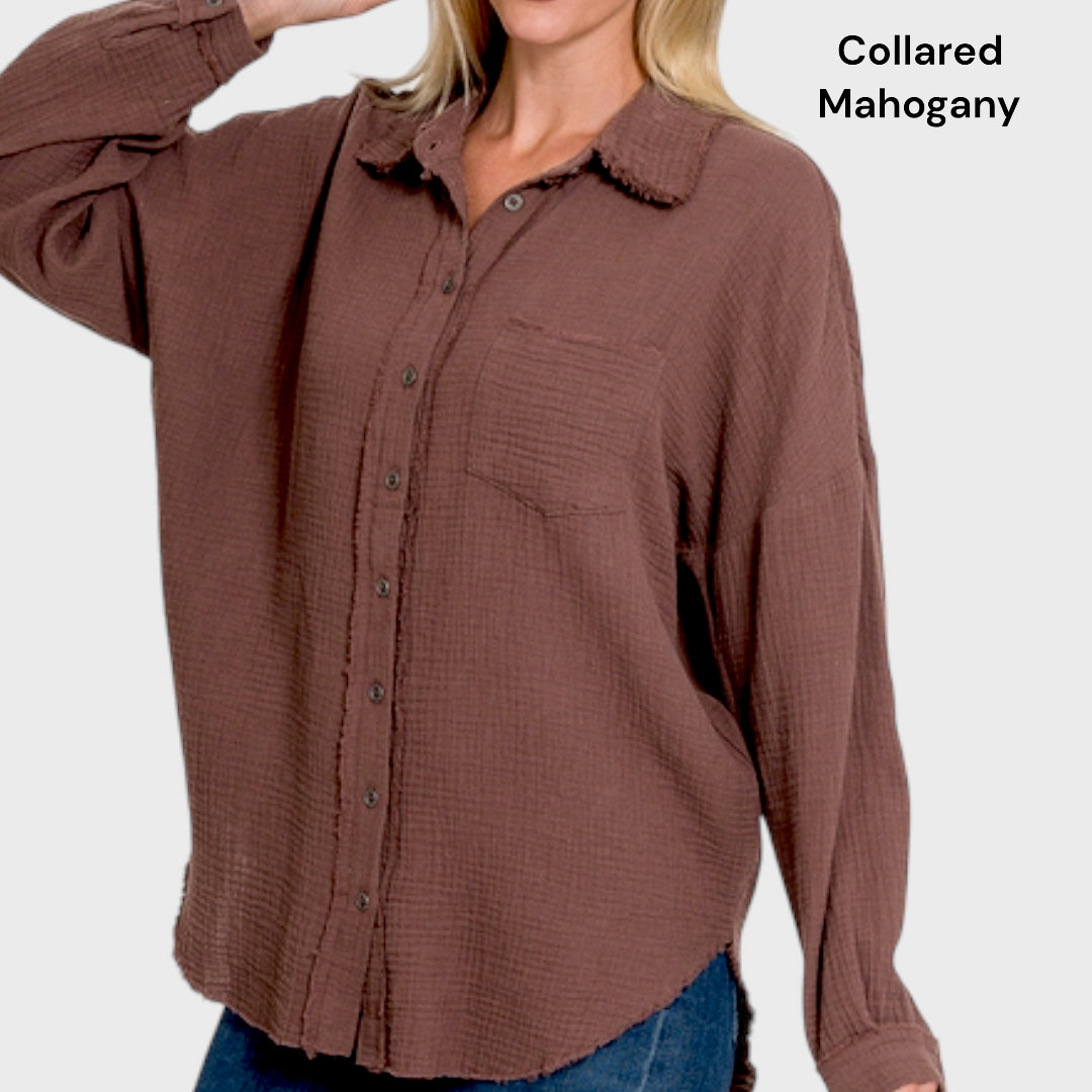 Our Button Down frayed edge Gauze Top has a casual look that can be easily elevated with your favorite bottoms and heels.