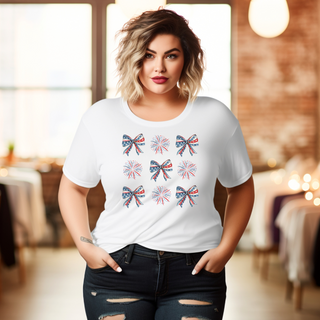 Celebrate the 4th of July in style with our Women's Patriotic Coquette Bow and Fireworks T-Shirt. This festive tee features an eye-catching design of bows and fireworks, making it perfect for Independence Day events or any patriotic celebration.