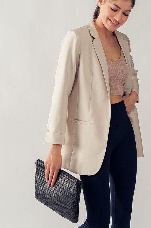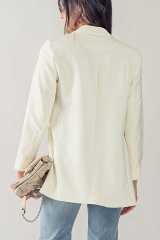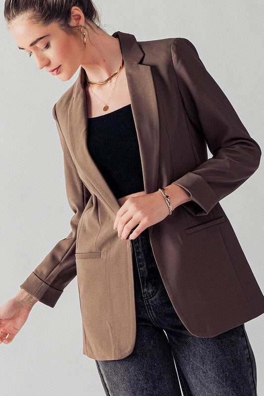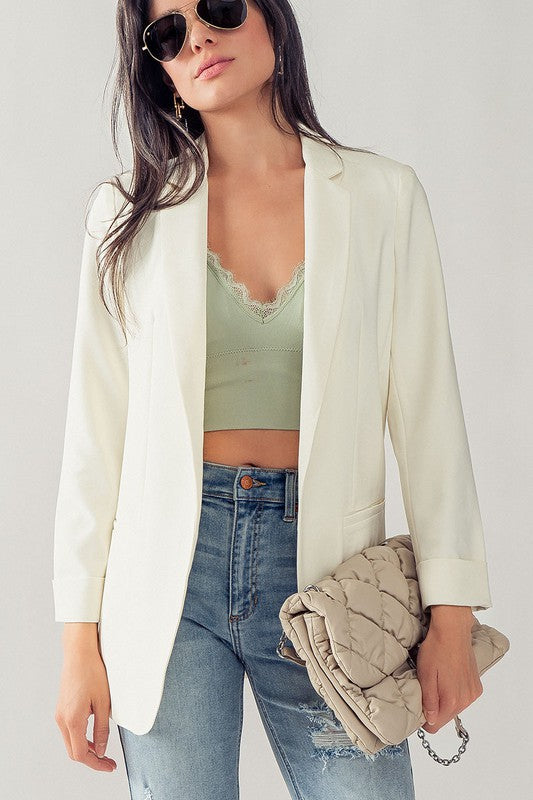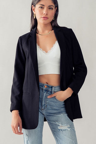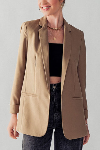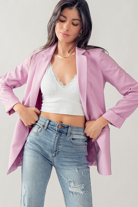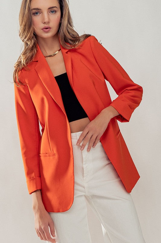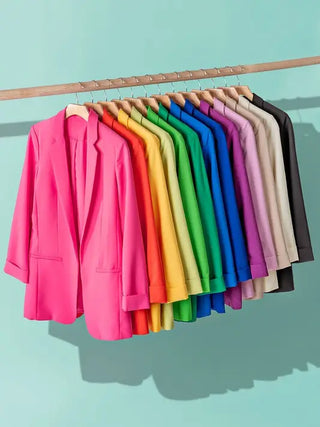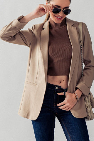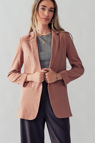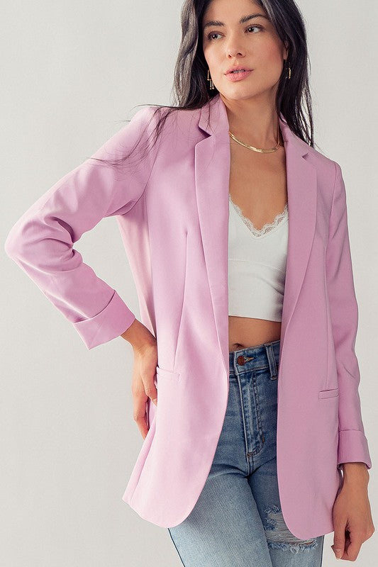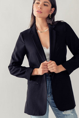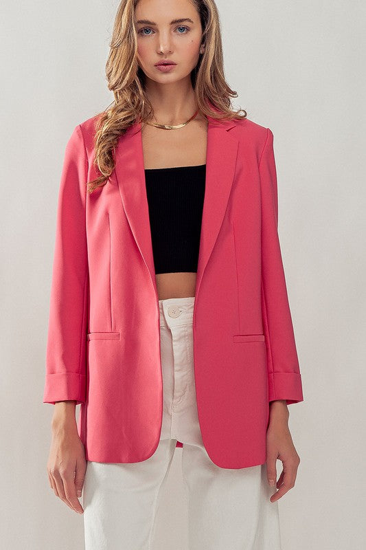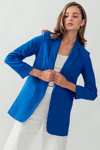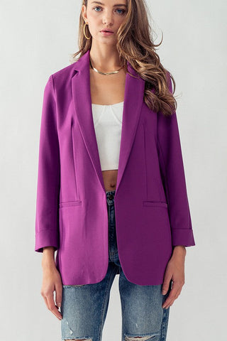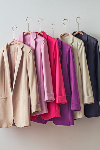 Go for a sophisticated look in our perfect pocketed blazer! There are so many colors to pick from. The color array goes from neutrals to bright and fun colors. Designed with an open front and a notched collar. Finished with long sleeves.