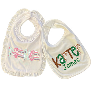 Mama's LOVE my custom personalized bibs!! The bib is a poly cotton blend to allow for the most vibrancy. They are offered with a plain or ruffled edge and has a velcro closure.