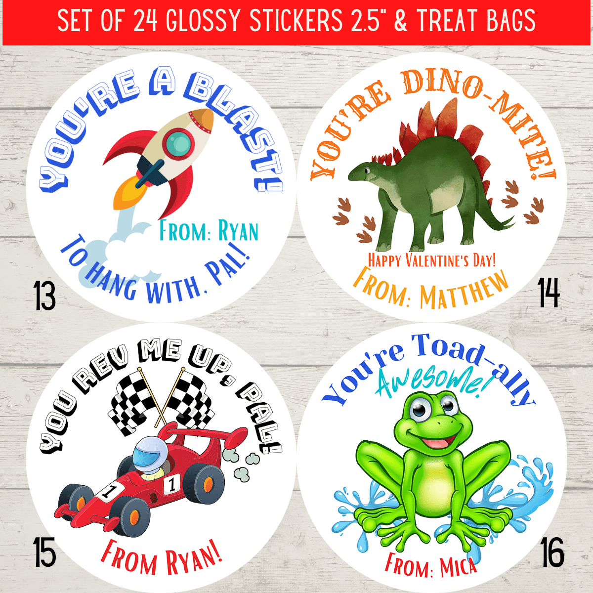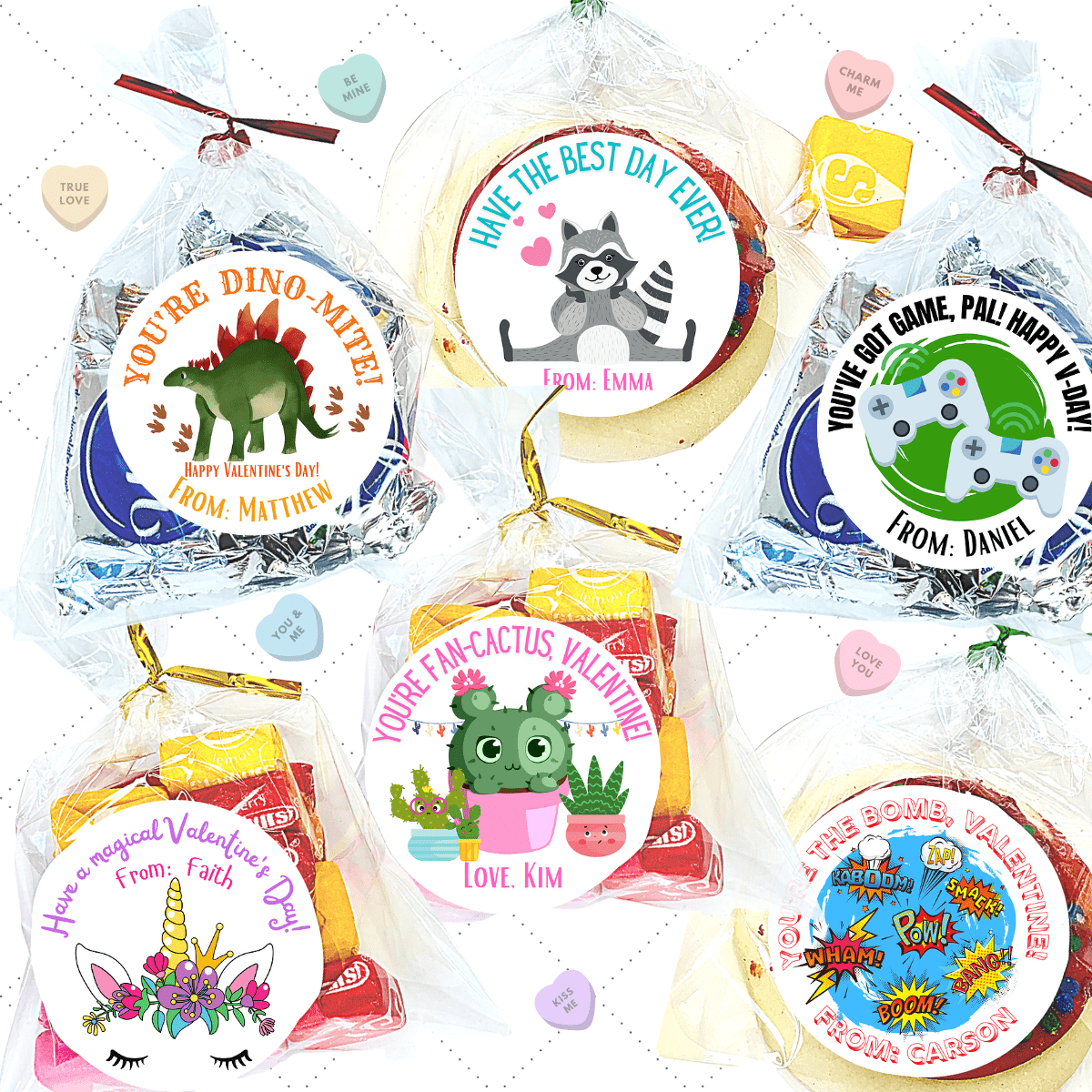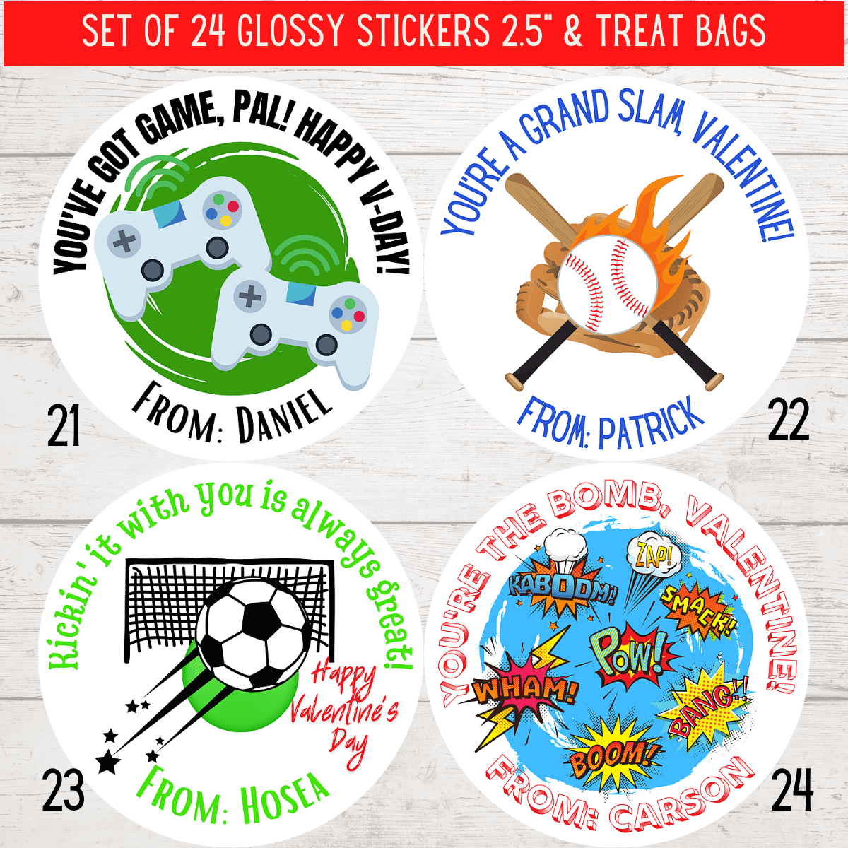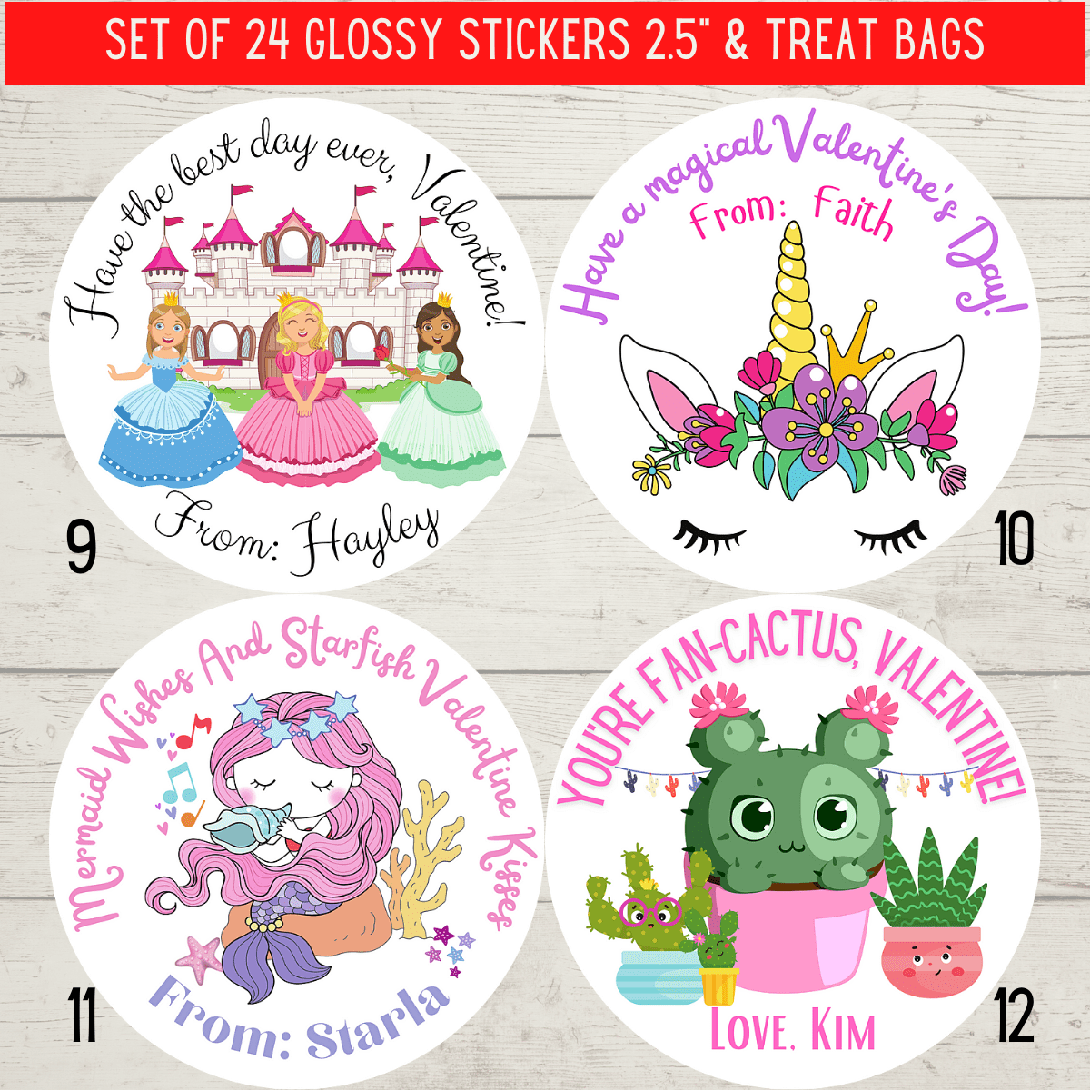 This set of 24 personalized Valentine stickers are a great timesaver with your child's or your personalized name printed on them. They are perfect for both boys, girls, and teachers too, for Valentine's Day and birthday parties! Use them on classroom gifts, cupcake toppers, neighbor treats, party favors, and more! Studio direct from Idaho, USA.