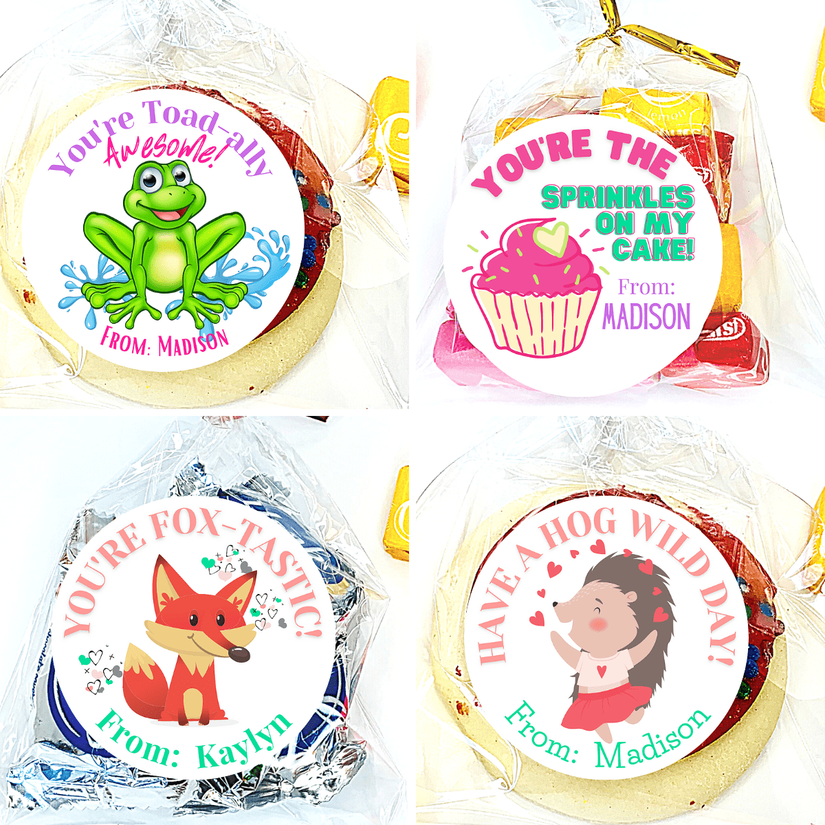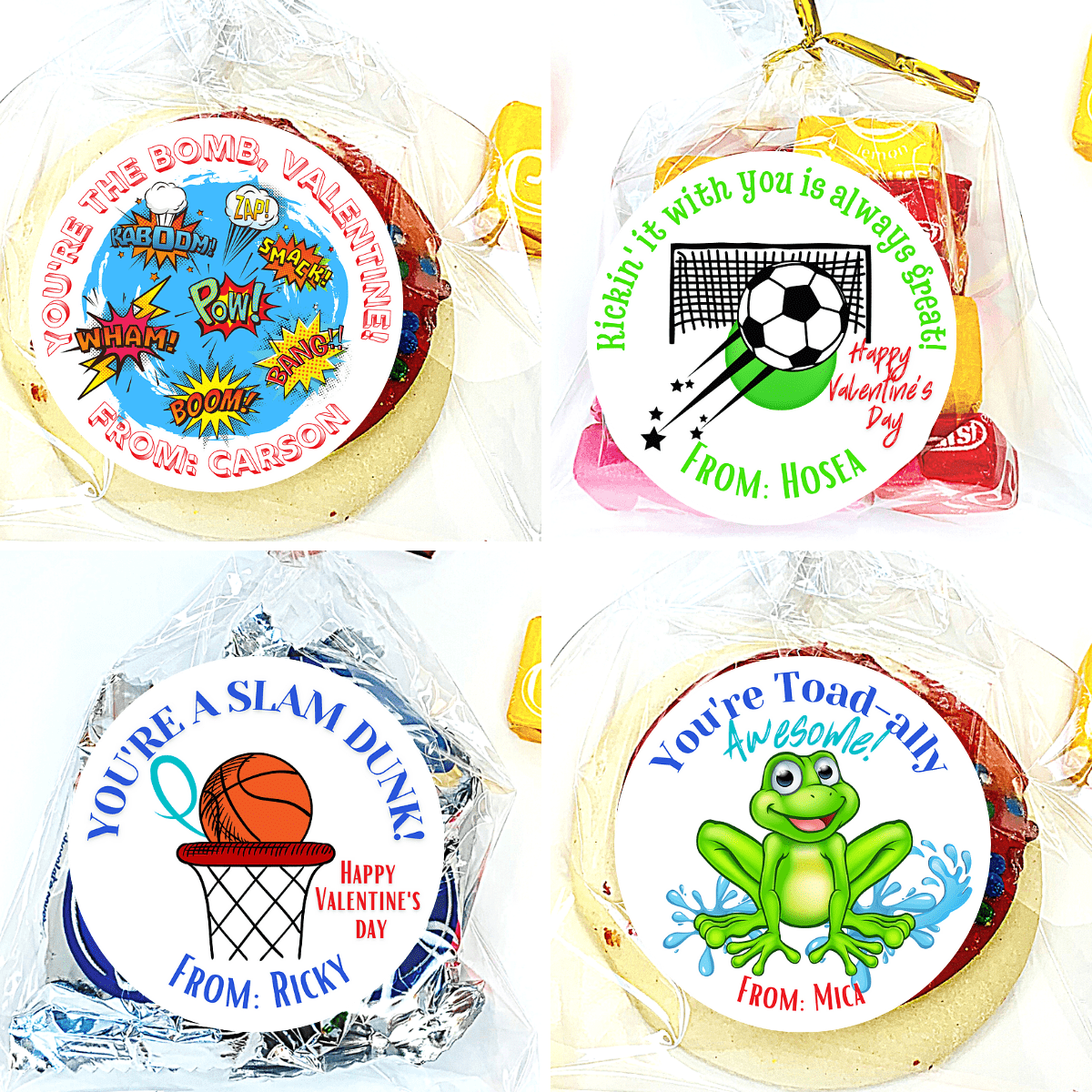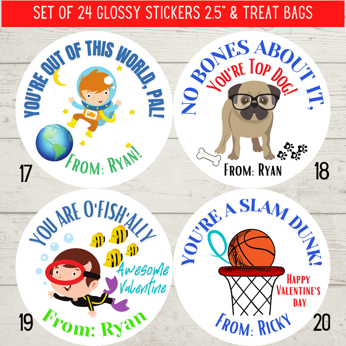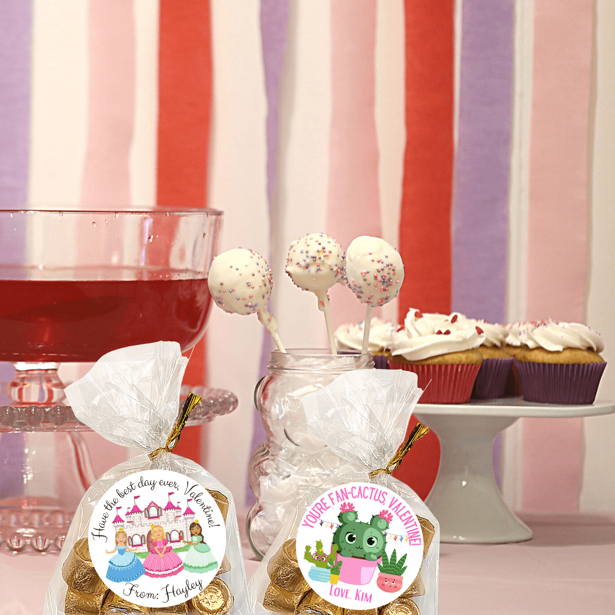 This set of 24 personalized Valentine stickers are a great timesaver with your child's or your personalized name printed on them. They are perfect for both boys, girls, and teachers too, for Valentine's Day and birthday parties! Use them on classroom gifts, cupcake toppers, neighbor treats, party favors, and more! Studio direct from Idaho, USA.