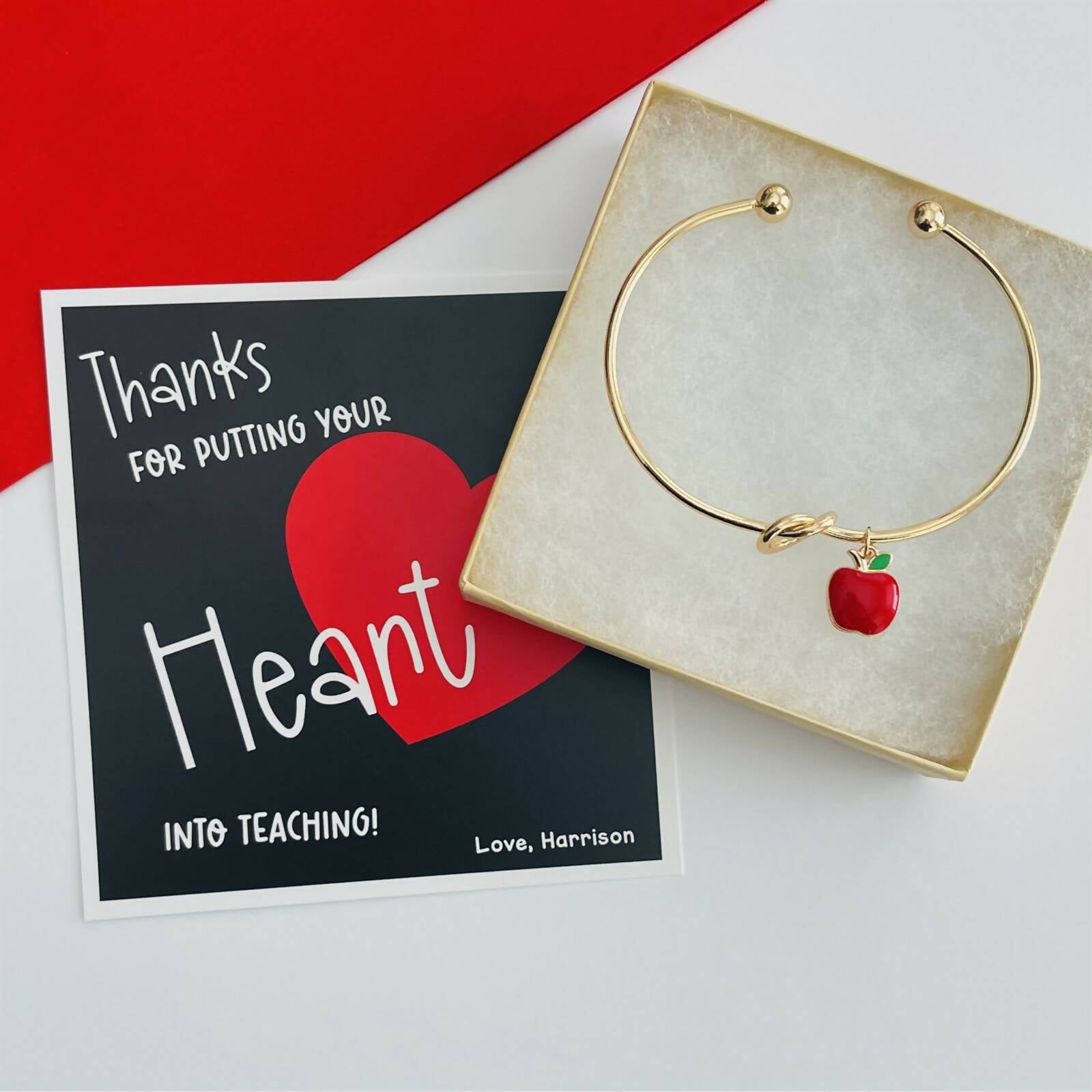 We LOVE our teachers. Surprise that wonderful teacher with a beautiful, gold plated apple charm bracelet with a personalized gift card. Ready to gift, includes the bracelet, card, box and ribbon. All the work is done. The bracelet is adjustable in size and is a beautiful gold.