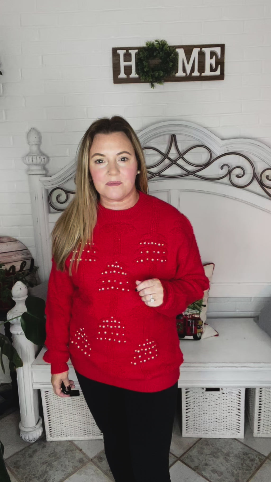 Get ready for all things merry with this puffy Christmas tree with embellished pearls knit sweater pullover. A round neck and an oversized fit completes this adorable design.