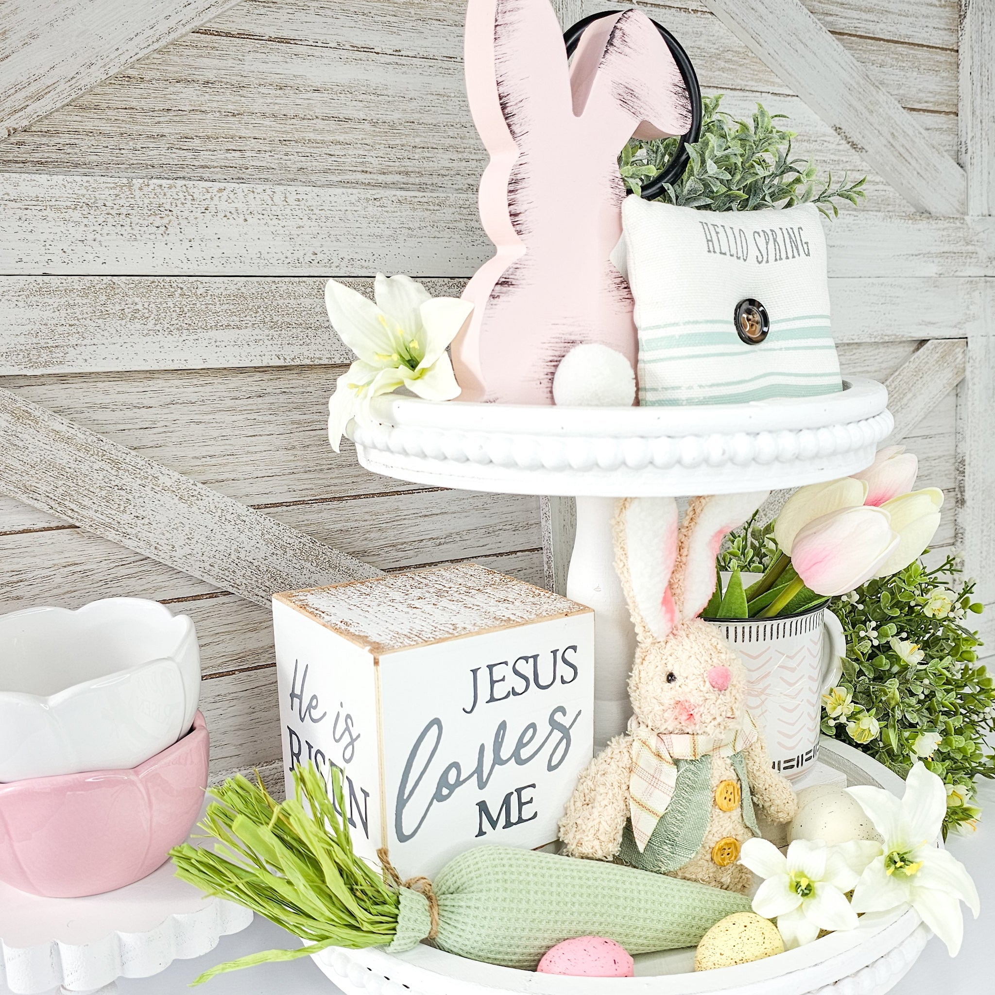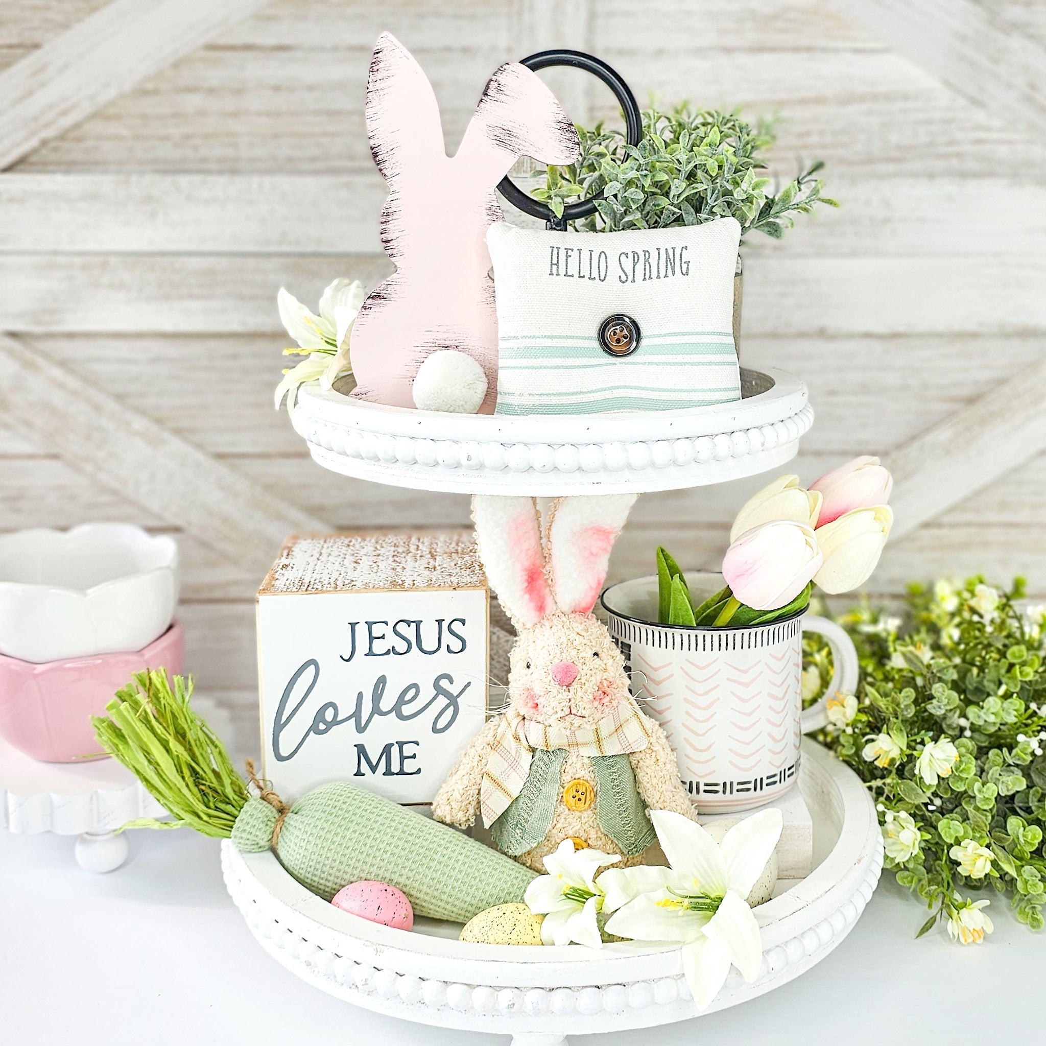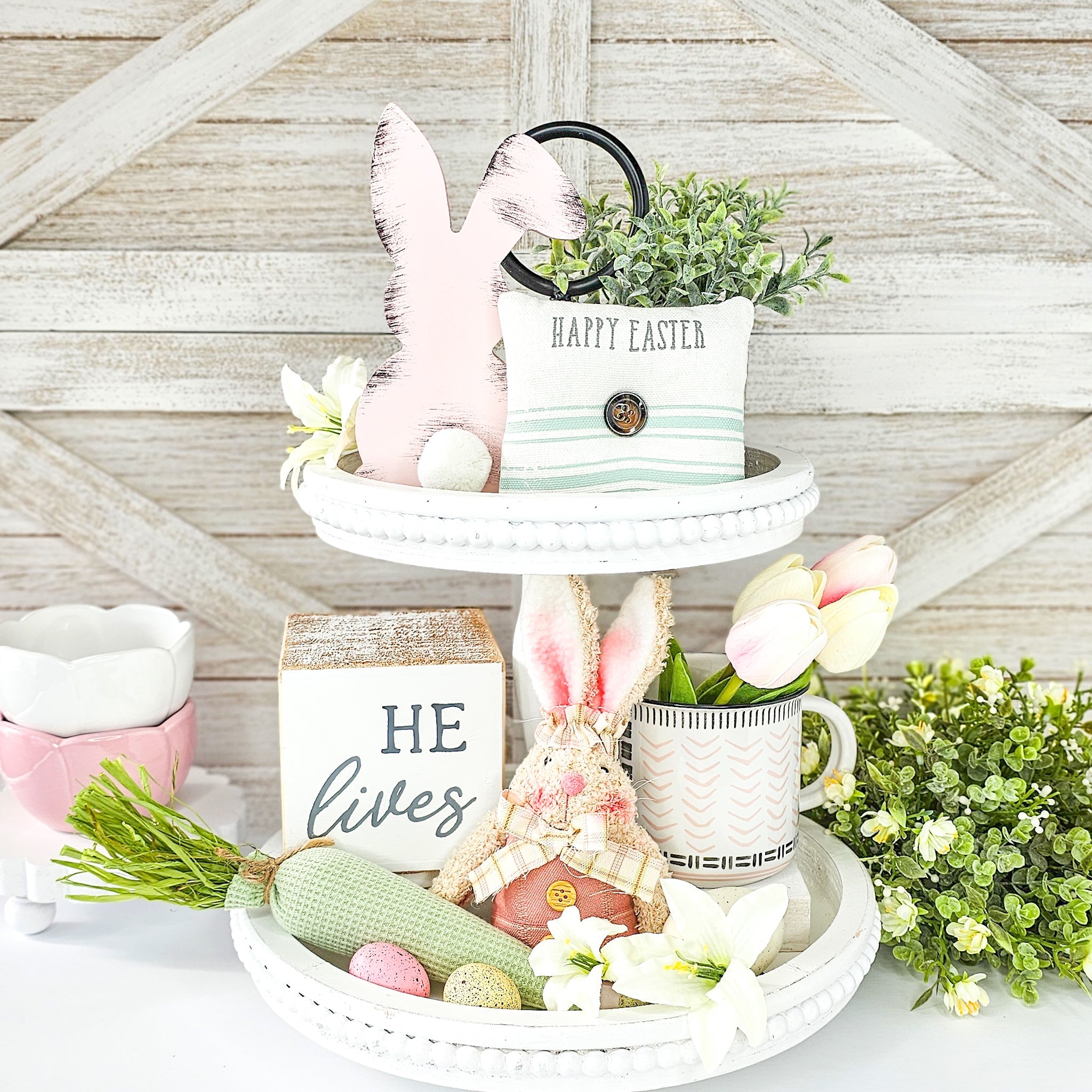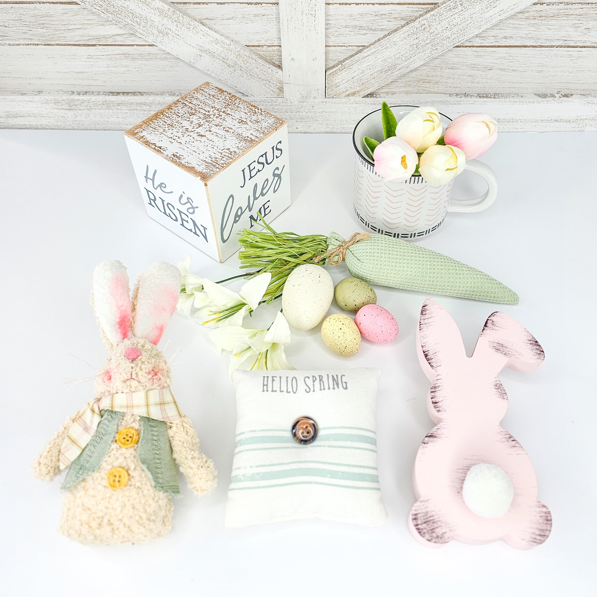 Transform your tiered tray, shelf or mantel into a stunning display with our Easter decor set. With a variety of heights, colors, and textures carefully selected for perfect coordination, this set offers unbeatable value. Why spend time hunting for matching pieces when we've done it for you? Simply sit back and watch as your space is transformed with ease!