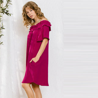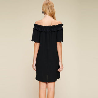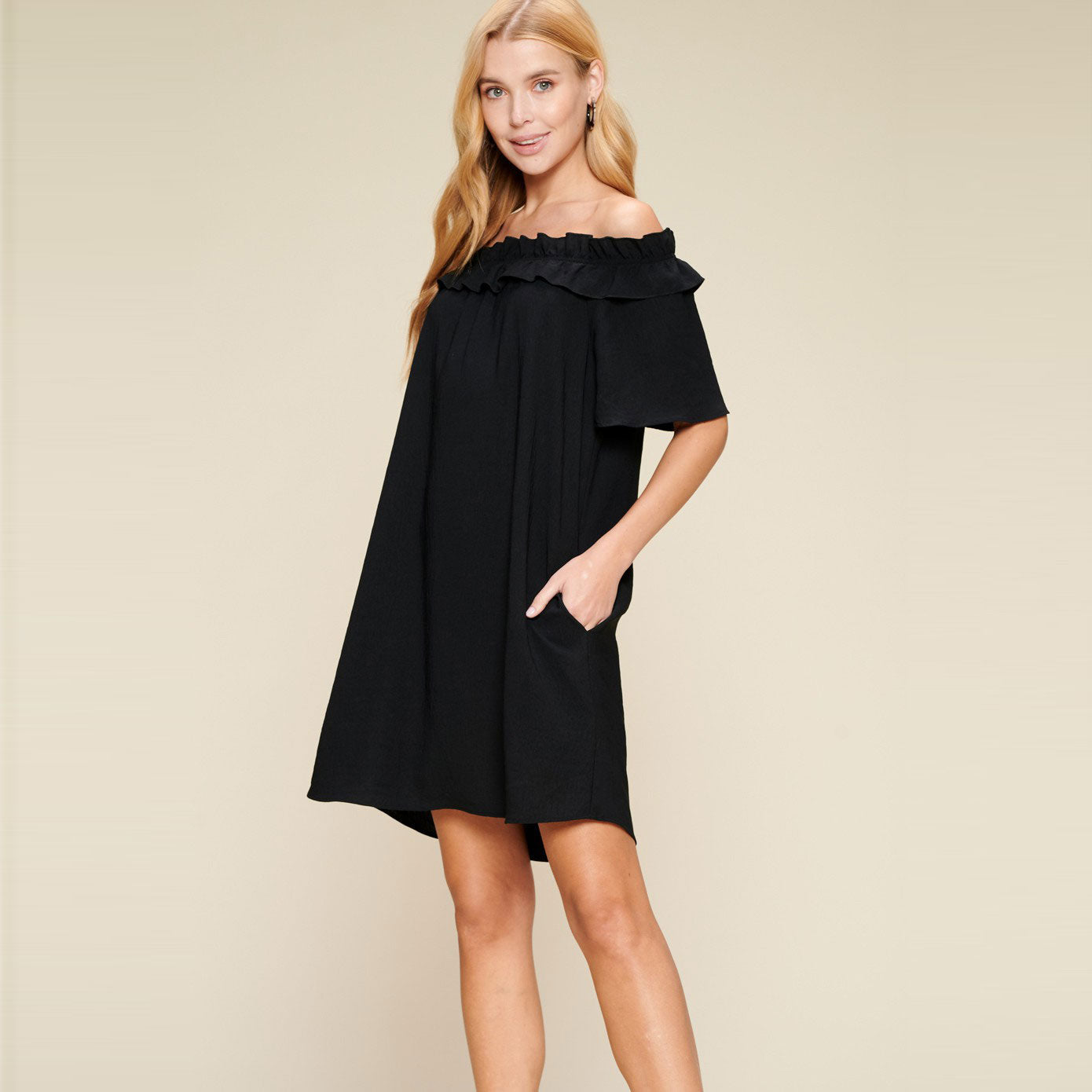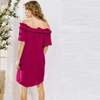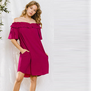 Get ready to turn heads this summer with our Sassy Summer dress! This fun and flirty dress features a flattering off-shoulder neckline with ruffled detailing and convenient side pockets. The solid woven fabric is non-sheer and falls just above the knee for a playful yet sophisticated look. Perfect for a day at the beach, a weekend brunch with friends, or a night out on the town, this dress is sure to be a staple in your summer wardrobe. You'll love how easy it is to style this dress with your favorite sandals or heels. Don't miss out on this must-have piece for the season!