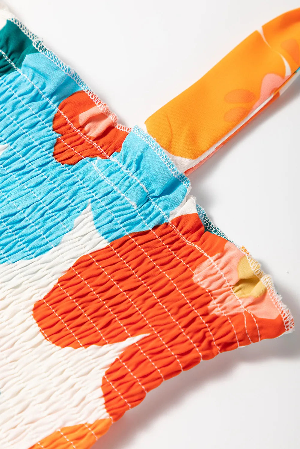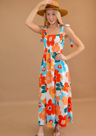 Illuminate your day in this radiant long floral dress. Crafted from lightweight, soft fabric adorned with a vibrant floral print, it features self-tie straps, a smocked bodice, and hidden pockets. The fitted bodice transitions into a flared skirt, creating a flattering silhouette that's both stylish and comfortable.