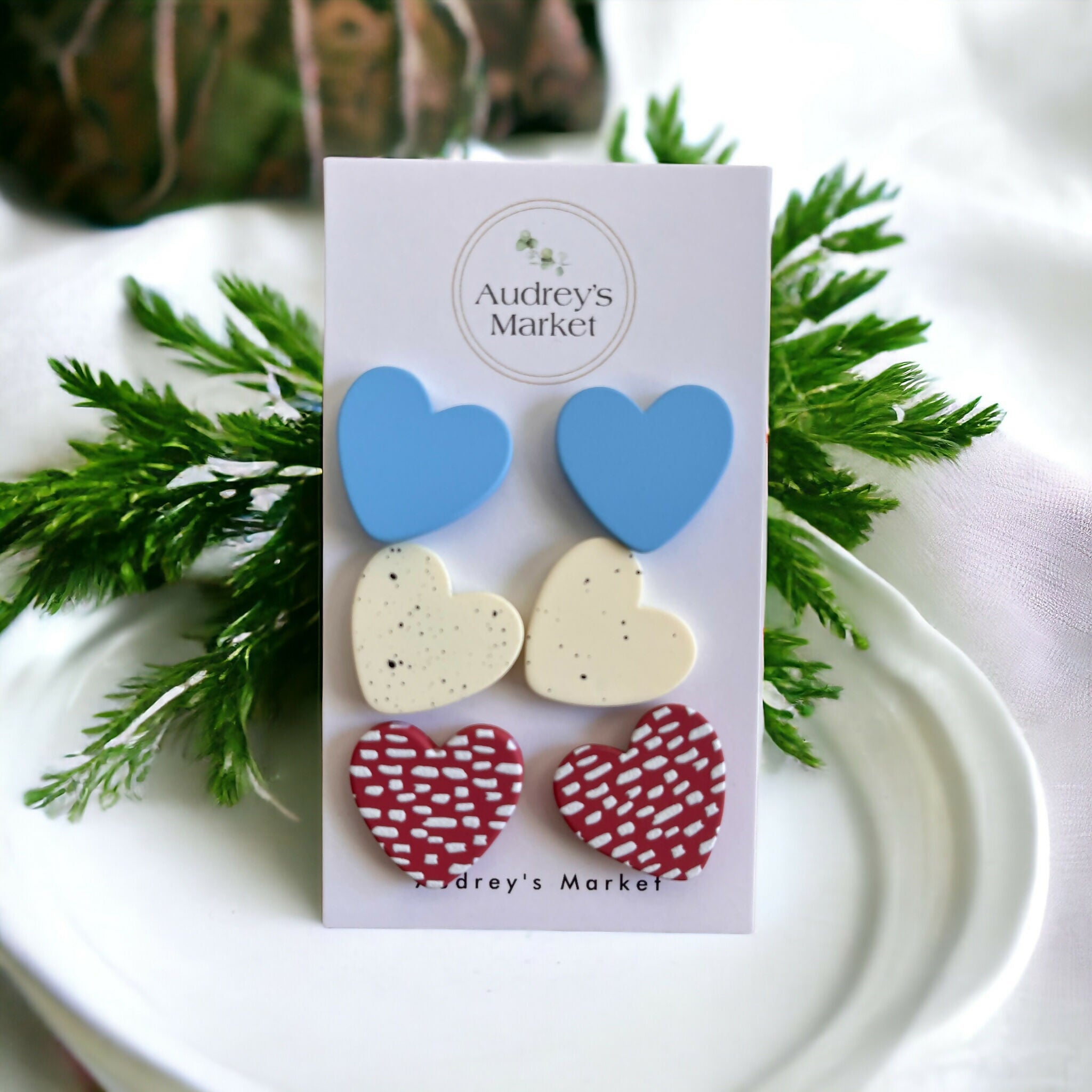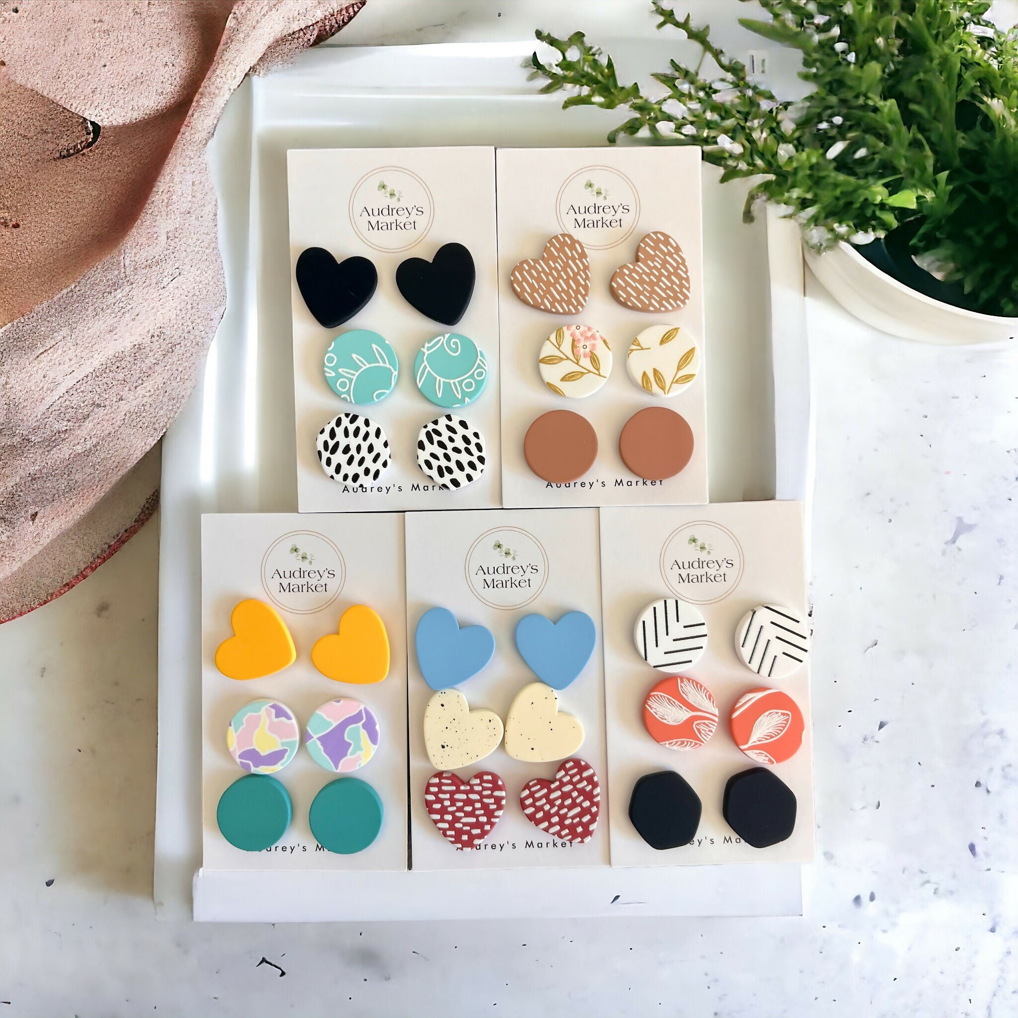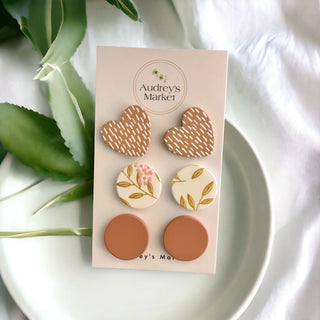 Style 2 - brown cheetah hearts, white tan circles, clay studs