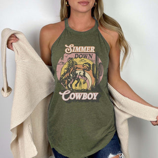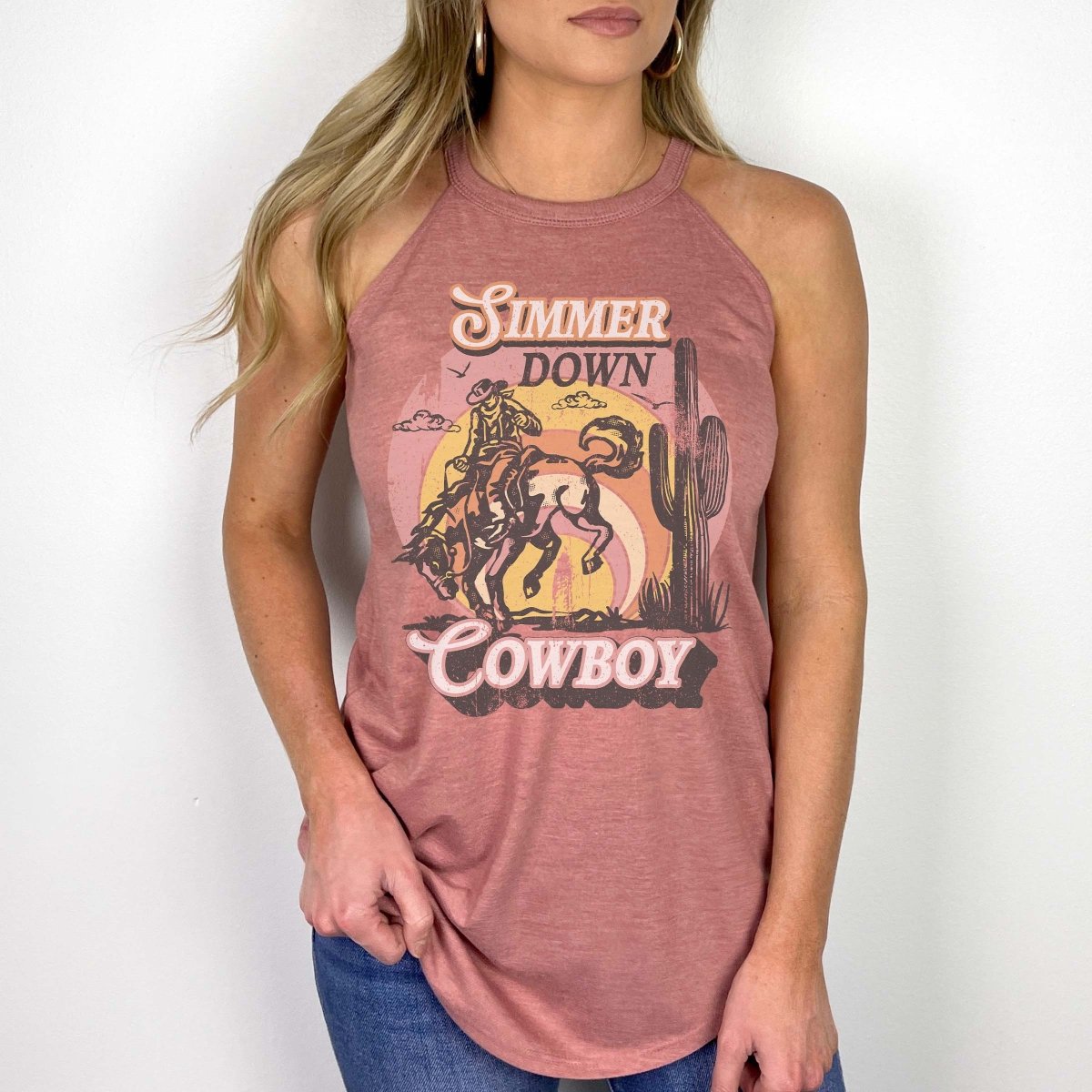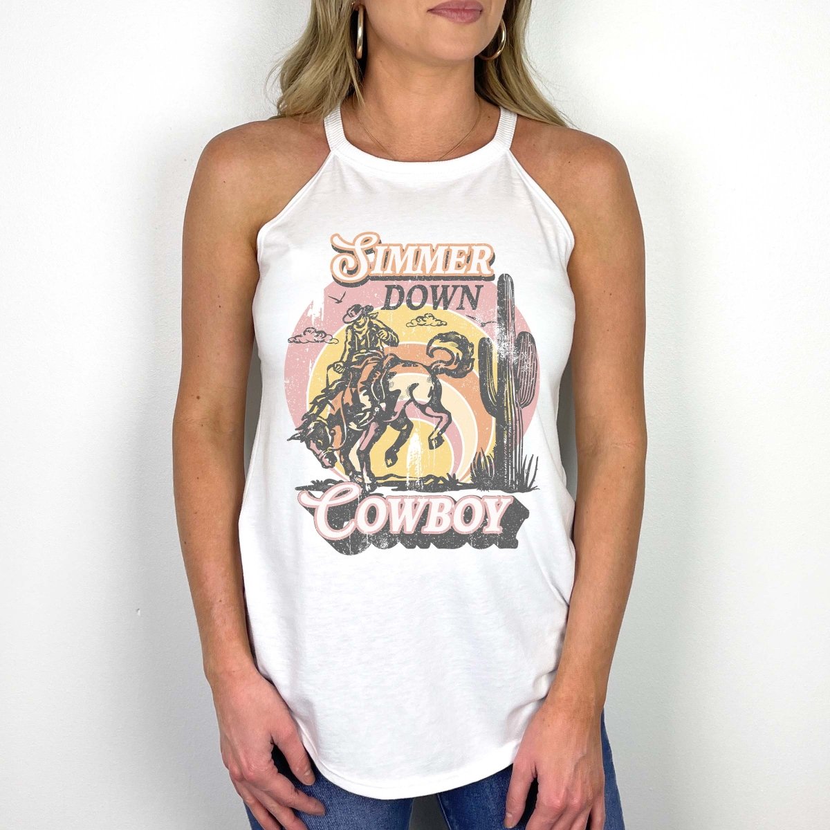 Embrace your fun-loving spirit with the Simmer Down Cowboy High Neck Tank. It's a must-have addition for any cowgirl's collection. Yeehaw!