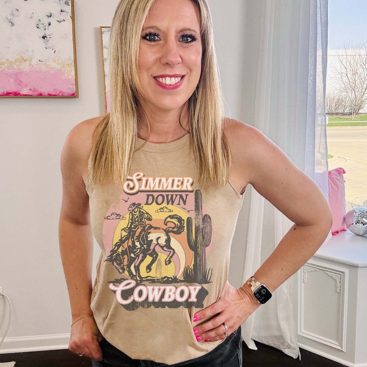 Crafted from ultra-soft, top-notch fabric, this cowboy tank ensures you stay comfortable while looking fabulous. Its playful "Simmer Down Cowboy" graphic adds a cheeky charm that's bound to grab attention and spread smiles.