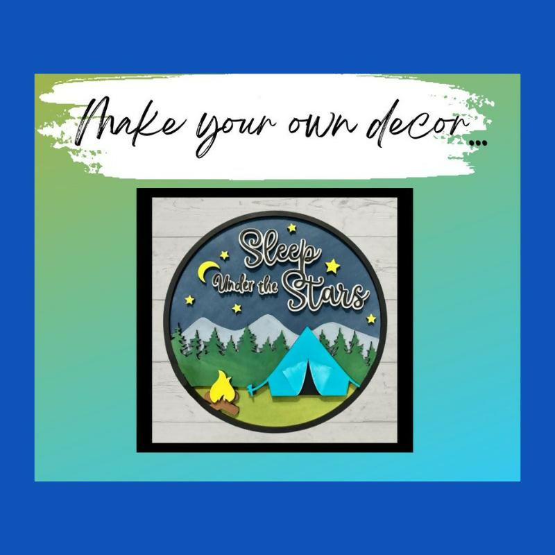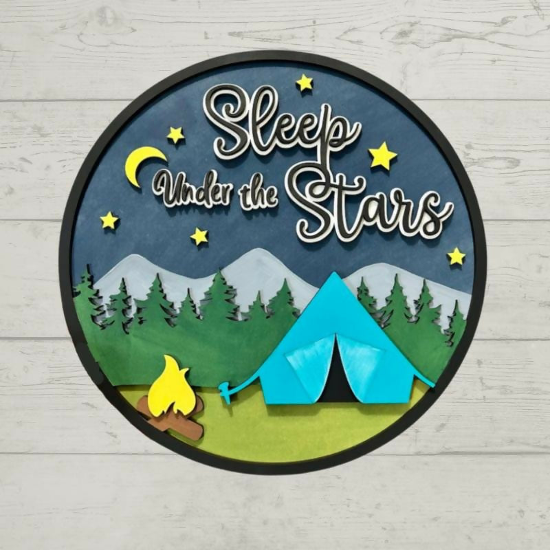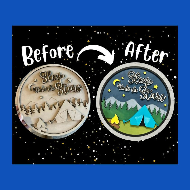Capture the magic of a night in the great outdoors with our "Sleep Under the Stars" DIY Craft Kit! This enchanting kit allows you to create a serene nighttime scene complete with a cozy tent, majestic mountains, lush woods, a crackling campfire, and a sky filled with twinkling stars and a glowing moon, all accompanied by the peaceful words "Sleep Under the Stars." Designed for crafters of all levels, this kit provides everything you need (except for paint) to paint and assemble a captivating piece of decor that brings the beauty of nature and the wonder of starry nights into your home. Whether for yourself or as a special gift, this kit is a perfect way to celebrate the tranquility and awe of sleeping under the stars!