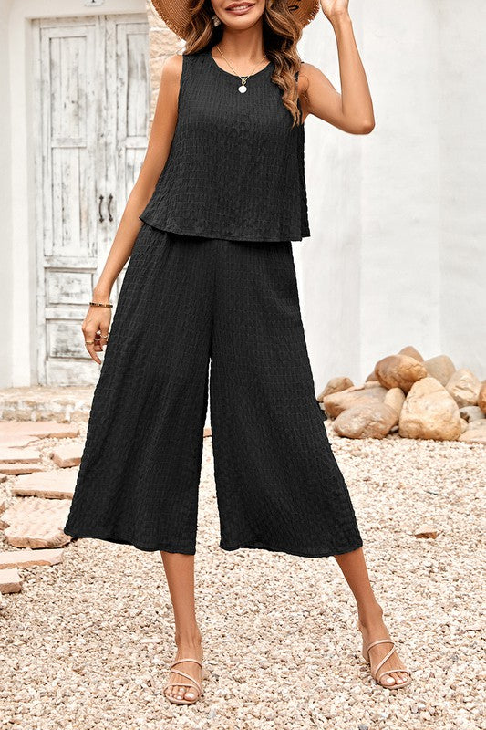 Effortlessly stylish and comfortable, this Sleeveless Top & Cropped Pants Jumpsuit features a round neck, wide leg cropped pants, and an elastic waist for a relaxed fit. Made from textured woven fabric, it's the perfect one-piece for any occasion. Bye bye outfit indecision!