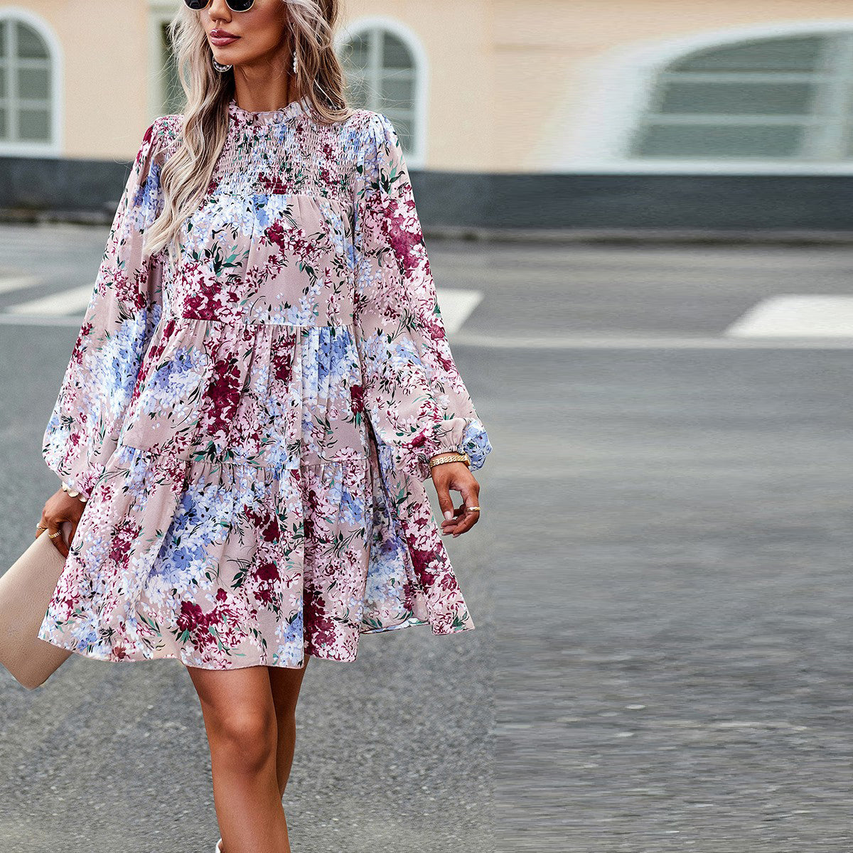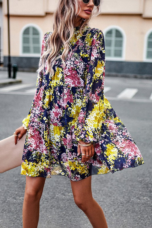 Elevate your style with the Smocked Flora Tiered Dress. Designed with a high ruffled neckline, smocked front, and tiered A-line shape, this lined dress offers a relaxed fit with long sleeves and elastic cuffs. The elastic waist and button back closure enhance the comfort, while the floral woven fabric adds a touch of elegance.