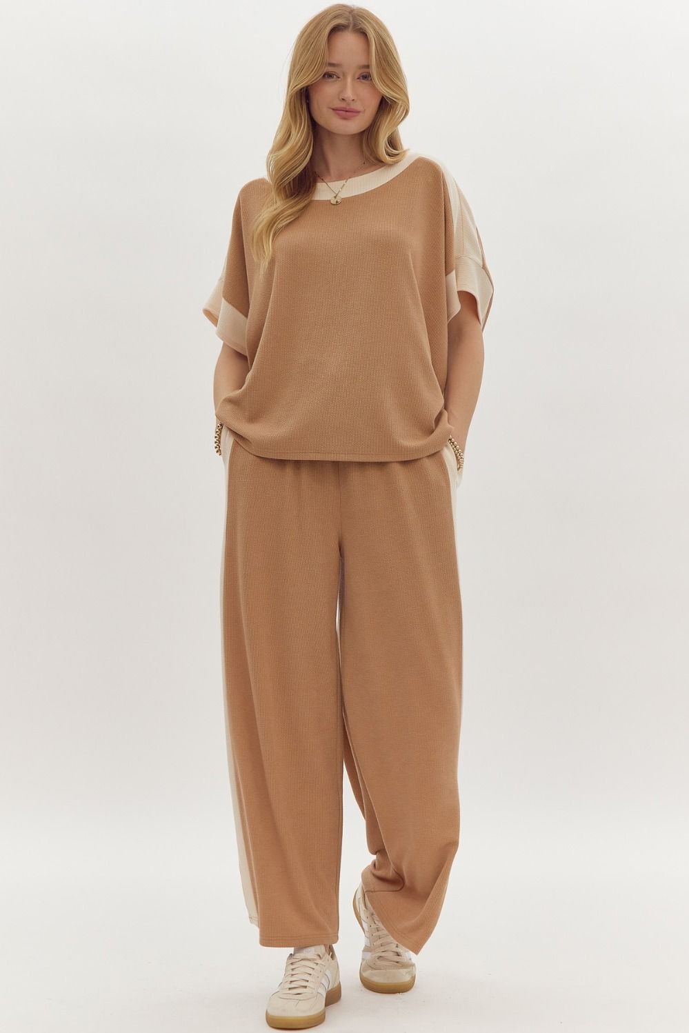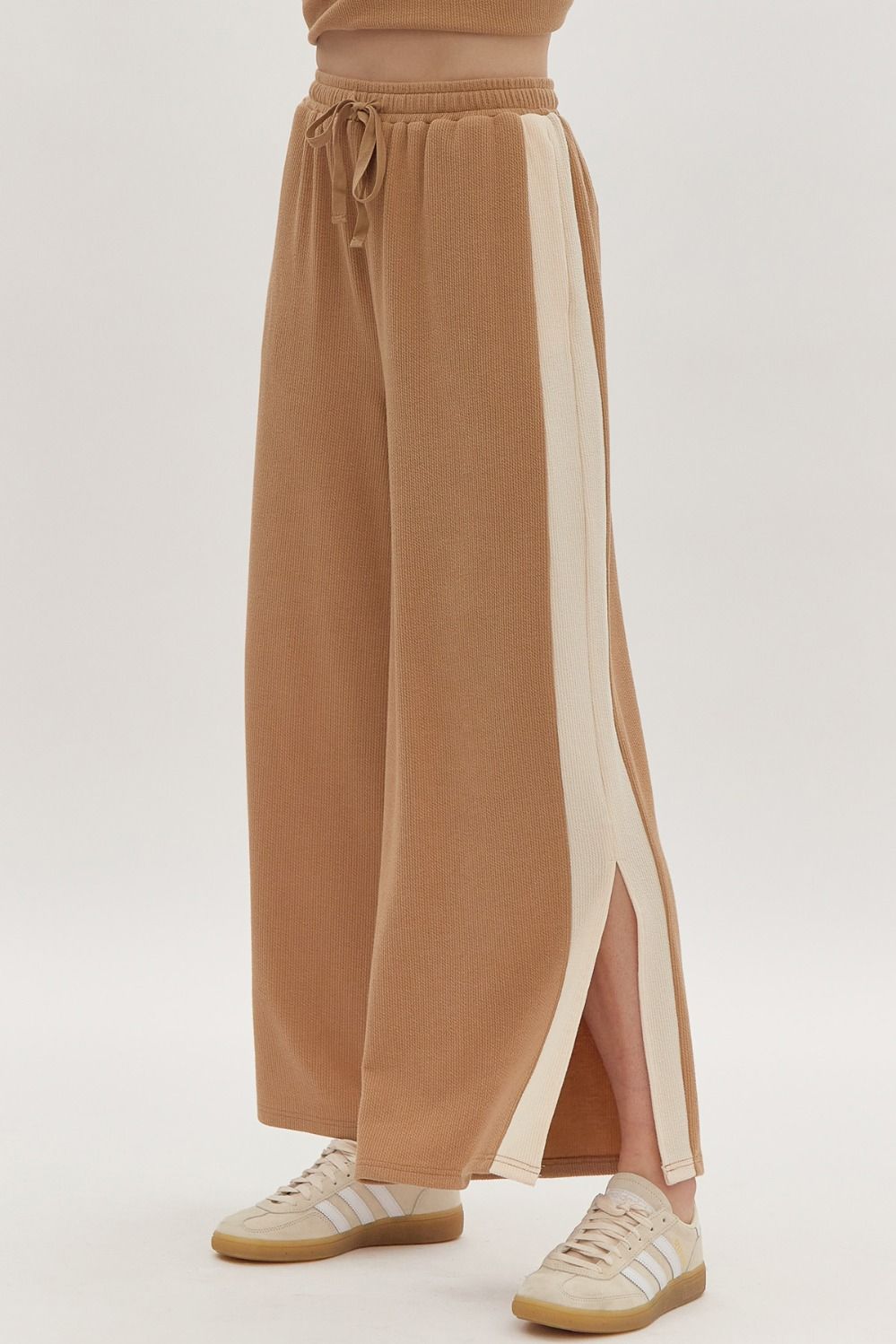 Solid ribbed high waisted wide leg pants featuring slit at sides. Elastic waistband and self tie. Pockets at sides. Unlined. Knit. Non-sheer. Lightweight.