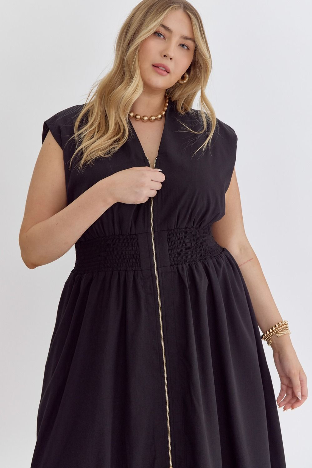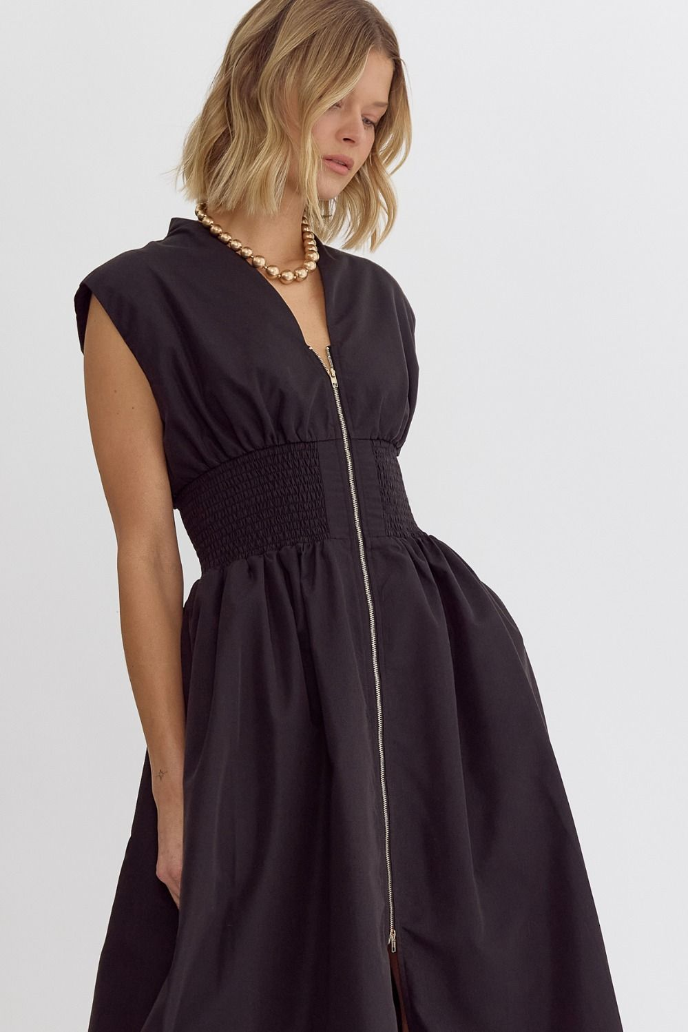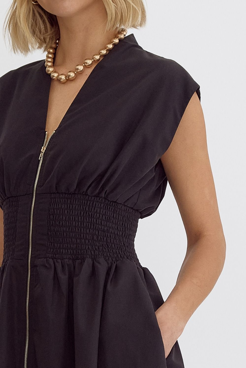 Solid v-neck sleeveless midi dress featuring dual zipper at front. Smocking at waist. Pocket at sides. Lined. Woven. Non-sheer. Lightweight.
