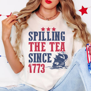 Step into a delightful mix of history and humor with the "Spilling Tea Since 1773" Comfort Color Graphic Tee. Perfect for those who enjoy adding a touch of playfulness to their outfit, this tee brings a lighthearted twist to your wardrobe.