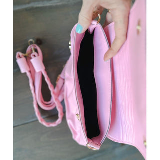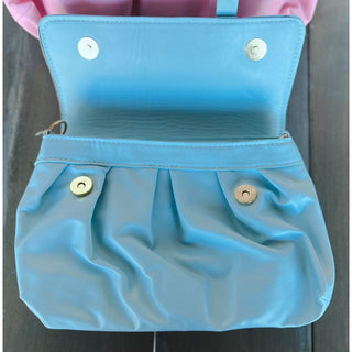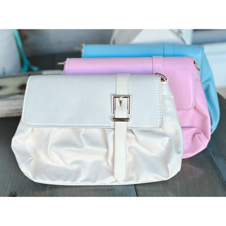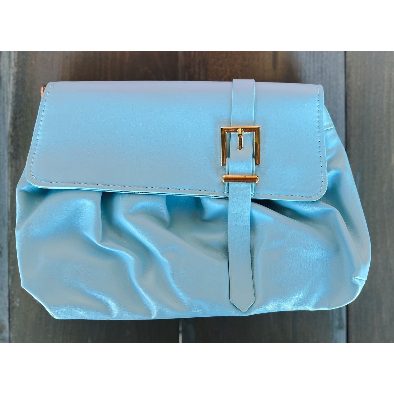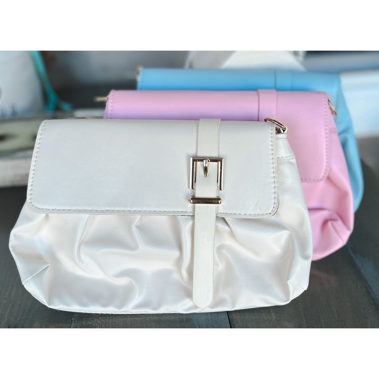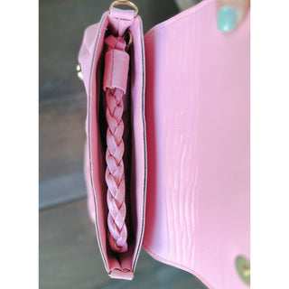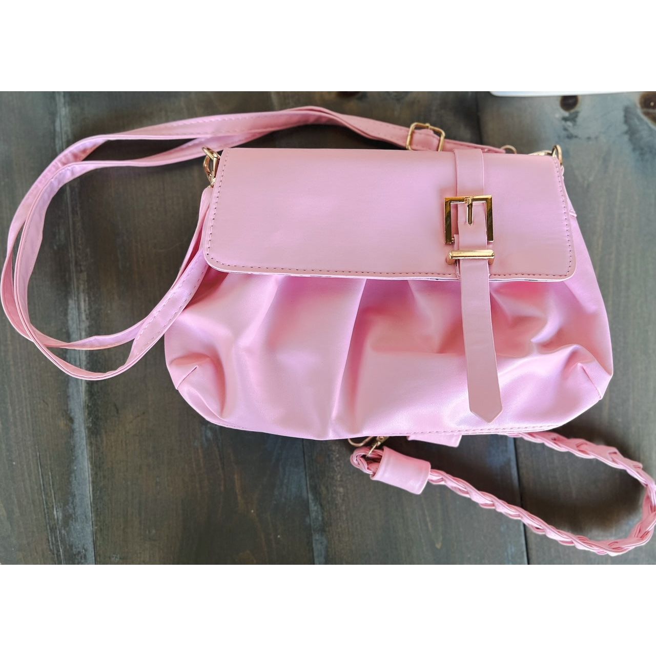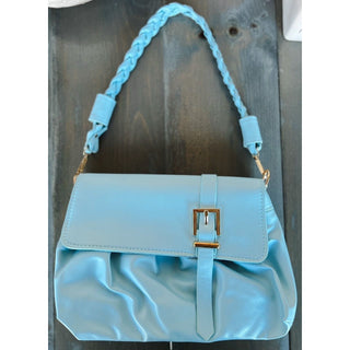 Beautiful Spring vegan leather handbag with short braided strap and an adjustable longer strap accented with a front tucking and buckle. Perfect colors for your Spring and Easter plans.