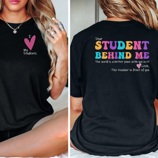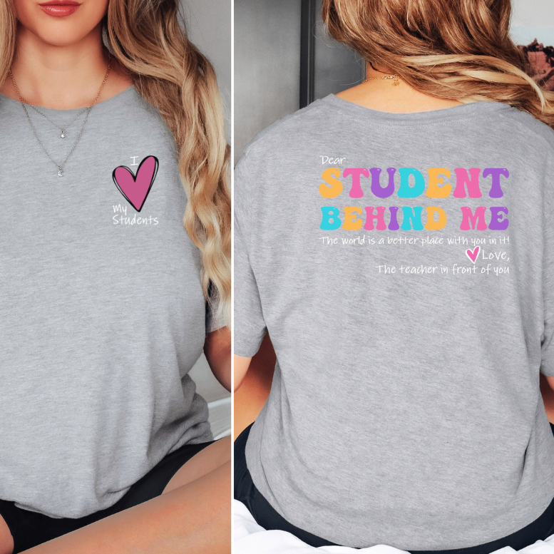 On the front, you'll find "I love my students," Turn to the back, and you'll discover a message addressed to the student behind the wearer: "Dear student behind me, the world is a better place with you in it. Love, the teacher in front of you." This heartfelt message serves as a reminder of the positive influence that students bring to the world, and the deep appreciation that teachers hold for each and every one of them.
