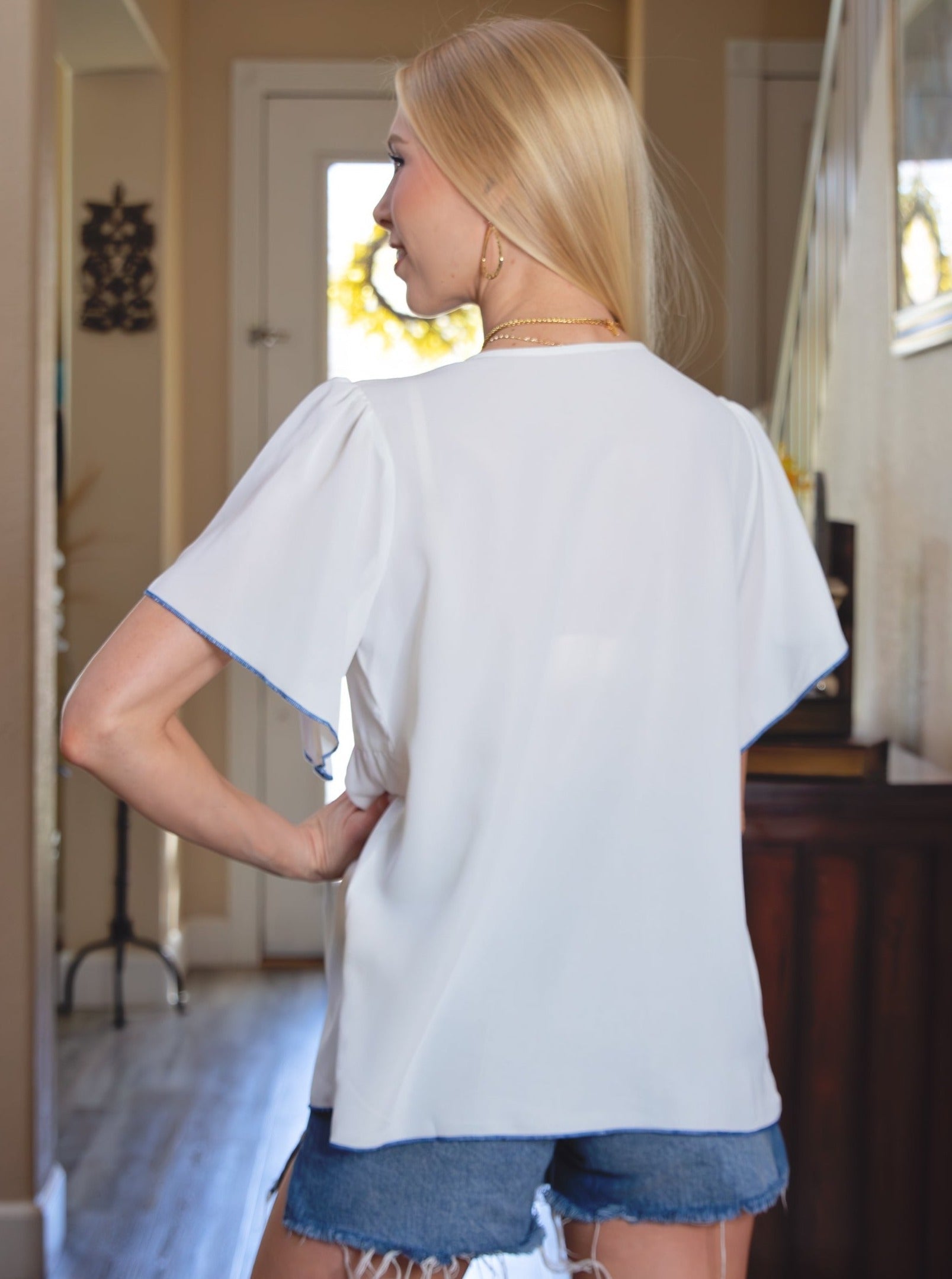 Transform your everyday style with our new Casual Tie Front Floral Print Flounce Sleeve Top. It has a beautiful flower design on the chest, a laced-up neck with a keyhole in the front, and elegant flounce sleeves that flutter. The babydoll design is flattering for all body types.