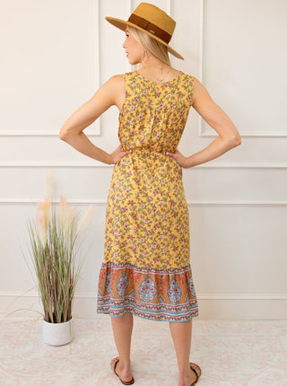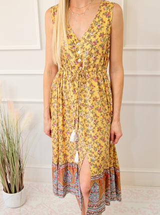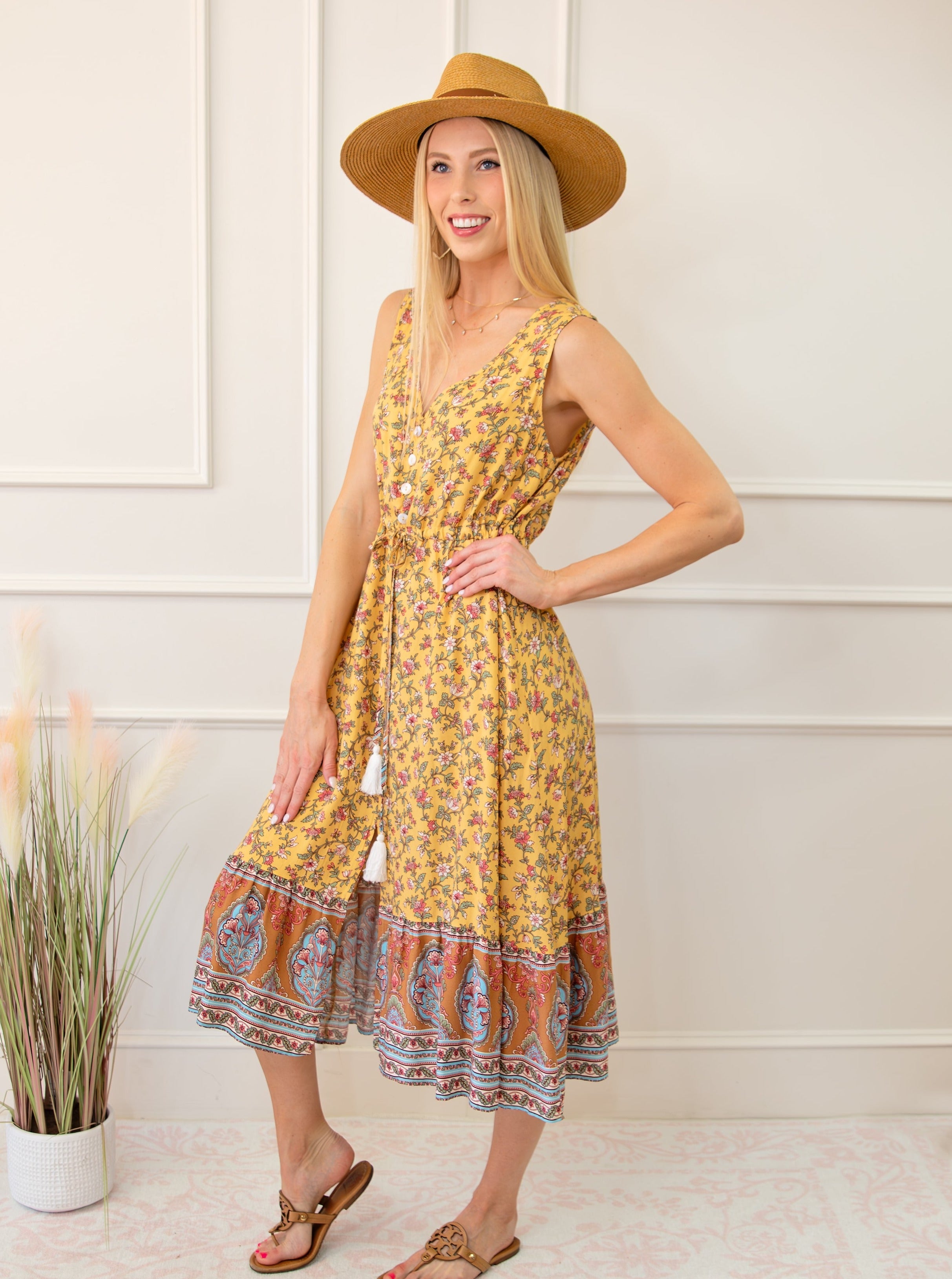 This pretty dress for women has flowers all over, making it charming. It's great for summer with its sleeveless design. The sexy V-neck highlights the neck and collarbones. The fitted tank top has buttons, and the high waist with an adjustable drawstring fits well. The contrasting hem makes the floral dress stand out. Beautiful and breathable, just perfect for a sunny day.