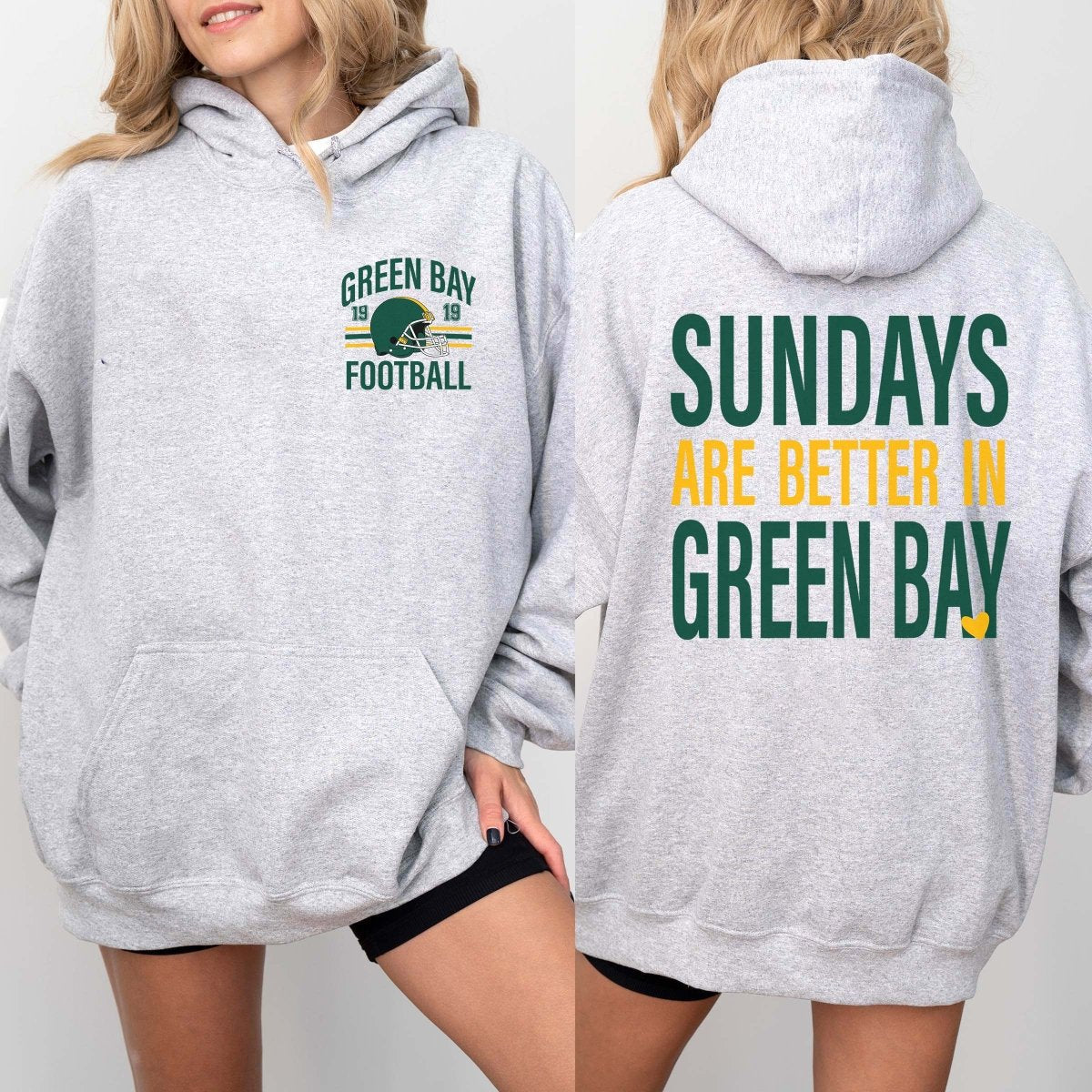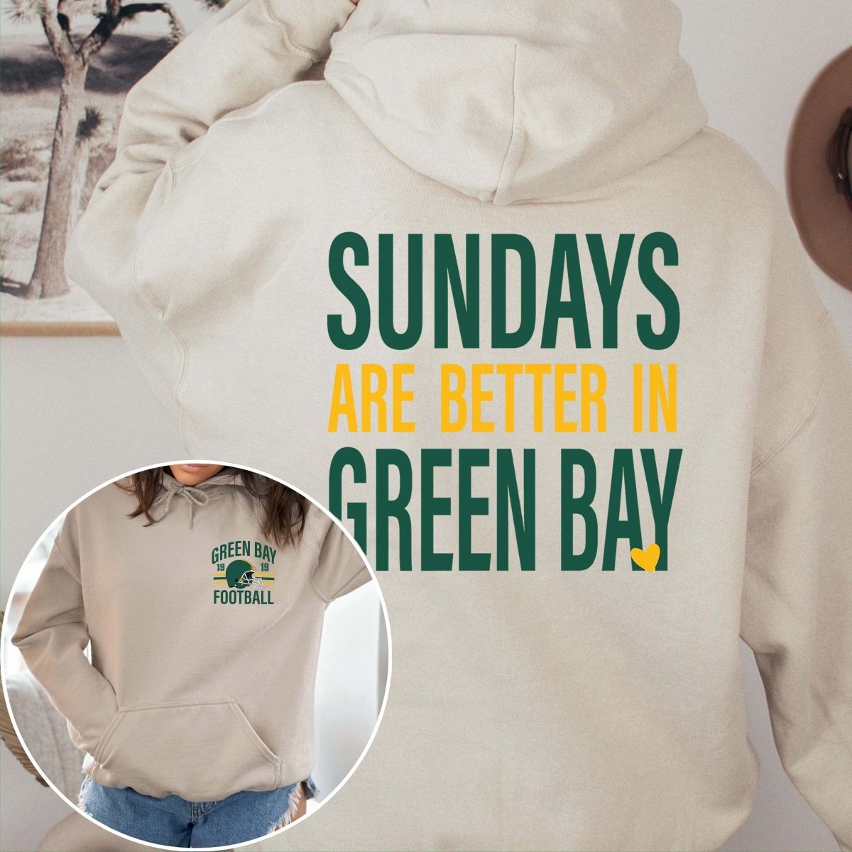 Embrace your passion for Green Bay football with the Sundays Are Better In Green Bay Graphic Hoodie! This delightful lime green graphic hoodie features a snug front pocket and a striking graphic on the back, making it an essential choice for any football fan.