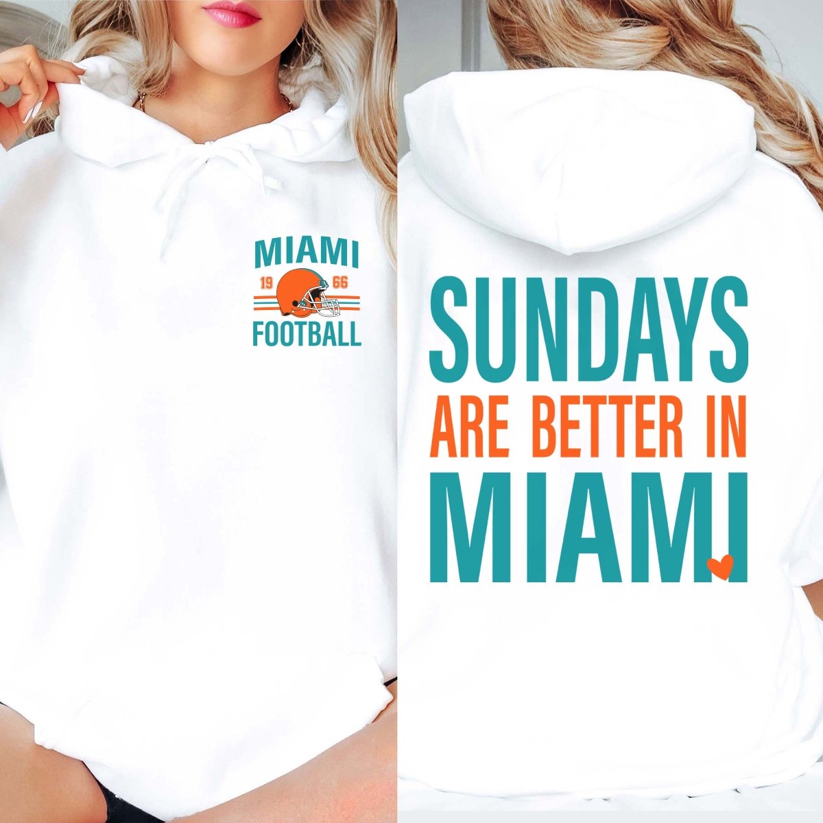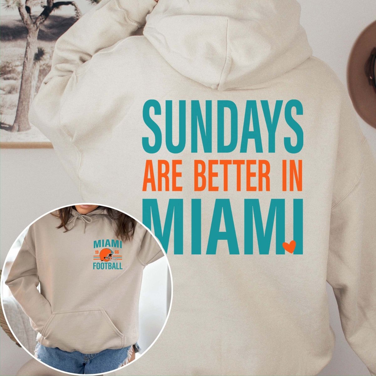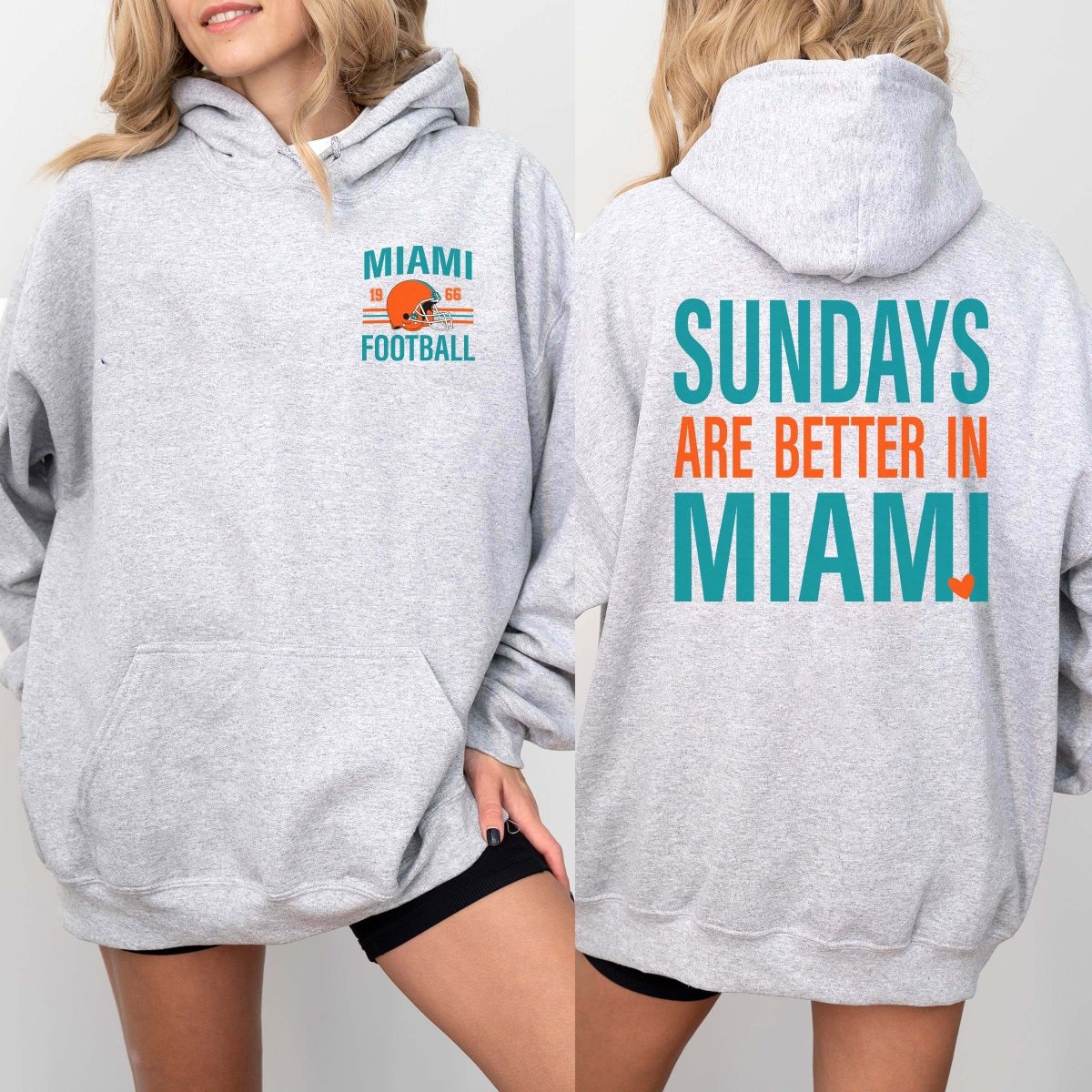 Wrap yourself in the vibrant spirit of Miami with our Sundays Are Better In Miami Graphic Hoodie! This hoodie embodies cozy chic with its inviting front pocket and an eye-catching graphic on the back. Whether you're cheering for your team or lounging at home, it's the perfect wear to express your Miami pride.