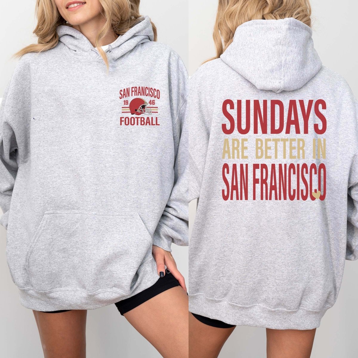 Embrace the spirit of San Francisco football with our Sundays Are Better In San Francisco Graphic Hoodie! This hoodie is your go-to piece for showing team pride, featuring a snug front pocket and a standout graphic on the back that speaks volumes.