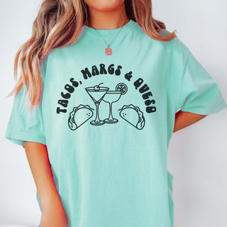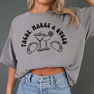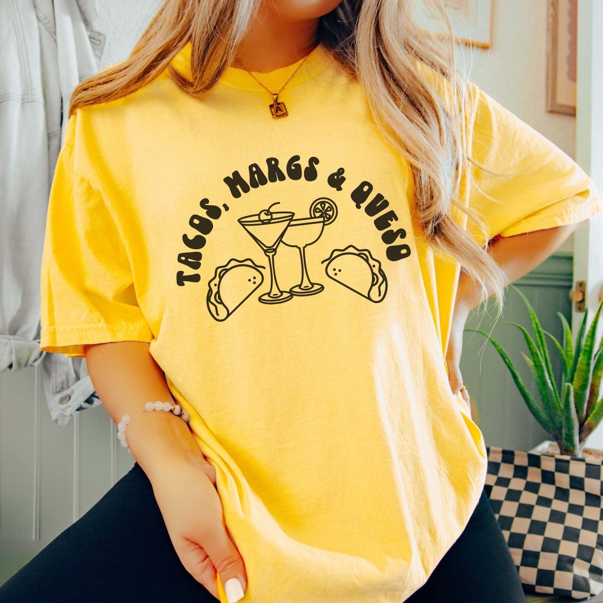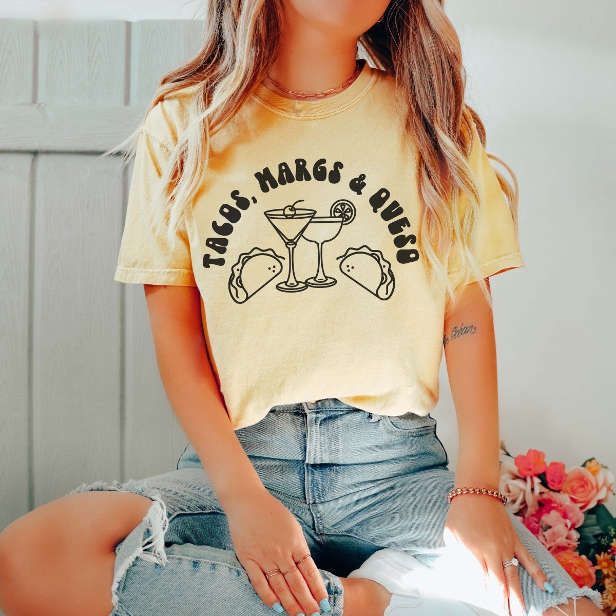 Celebrate your appreciation for Mexican flavors with our "Tacos Margs Queso" Comfort Color Tee. It’s a delightful homage to the beloved trio of tacos, margaritas, and queso! Made from premium Comfort Color fabric, this tee promises unbeatable coziness and resilience, perfect for sharing your love for Mexican cuisine in style.