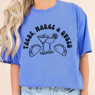 Why go for the ordinary when you can flaunt your favorite flavors in style with Limeberry Designs? Get your "Tacos Margs Queso" Comfort Color Tee today and kick off the party!