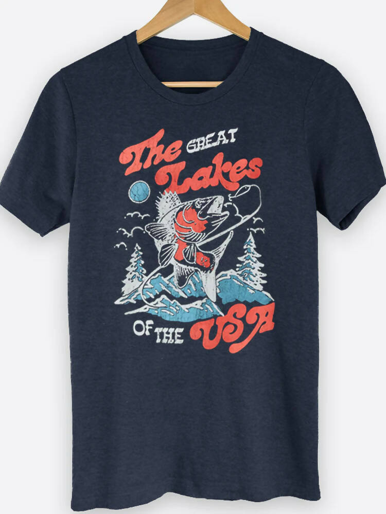The Great Lakes vintage inspired graphic tee. This unique and original design is perfect for both adults and youth. Our graphic tees are made using ultra soft and comfortable cotton based tees, ensuring a cozy fit for all-day wear. Our professional printing process guarantees vibrant colors that won't fade, allowing you to enjoy this fun design for many years to come.