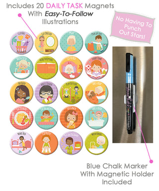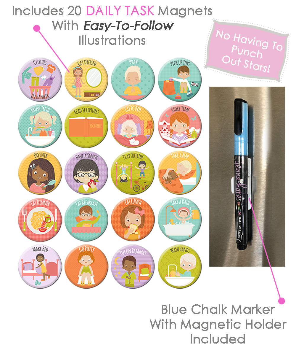 Don't forget our illustrated add-on magnet sets to help with chores, behaviors, and getting ready for school! Sold separately.