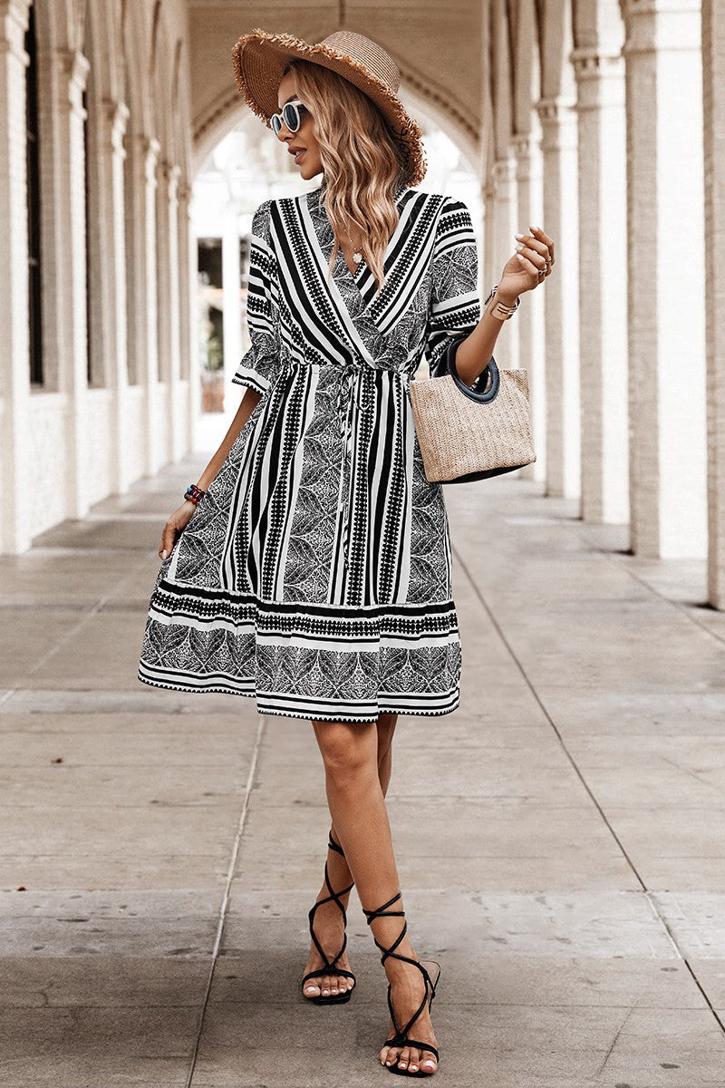 Introducing our V-Neck Fit and Flare Dress, a versatile and stylish addition to your wardrobe. This dress features a V-neck with a cross-front design, creating a flattering silhouette. The mid-length sleeves come with elastic ruffles for a touch of elegance and comfort. The elastic waist defines your figure, and the dress flows into a ruffled hem, giving it a chic A-line shape. Crafted from a black and white geo stripes pattern woven fabric, this dress adds a modern and playful touch to your look. With its above-the-knee length, it's perfect for various occasions. Elevate your style with the V-Neck Fit and Flare Dress for a sophisticated yet trendy ensemble.
