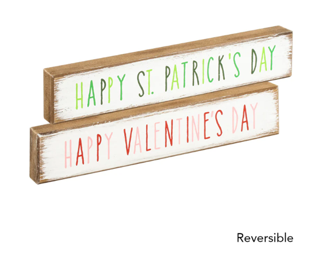 - Happy Valentine's Day/Happy St. Patrick's Day Reversible Wood Sign (8" x 1.5" x 0.75")