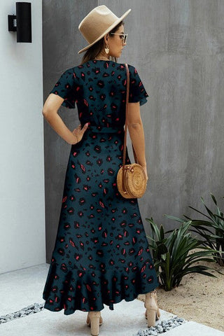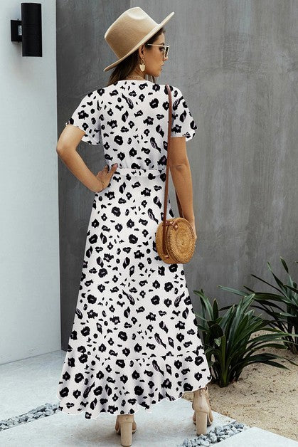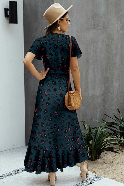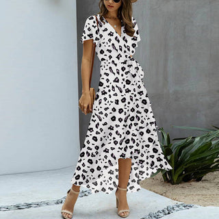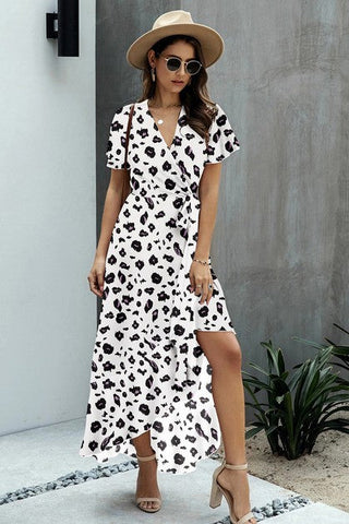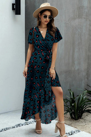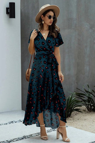 Embrace effortless elegance with the Vibrant Vista Wrap Dress. This dress features a flattering V-neck and wrap front design, short sleeves, and an elastic waist for a comfortable fit. The waist tie on the side and asymmetric ruffled hem add a touch of charm to this hi-lo A-line midi dress. Made from a woven fabric with an allover print, it offers a relaxed fit perfect for any occasion.