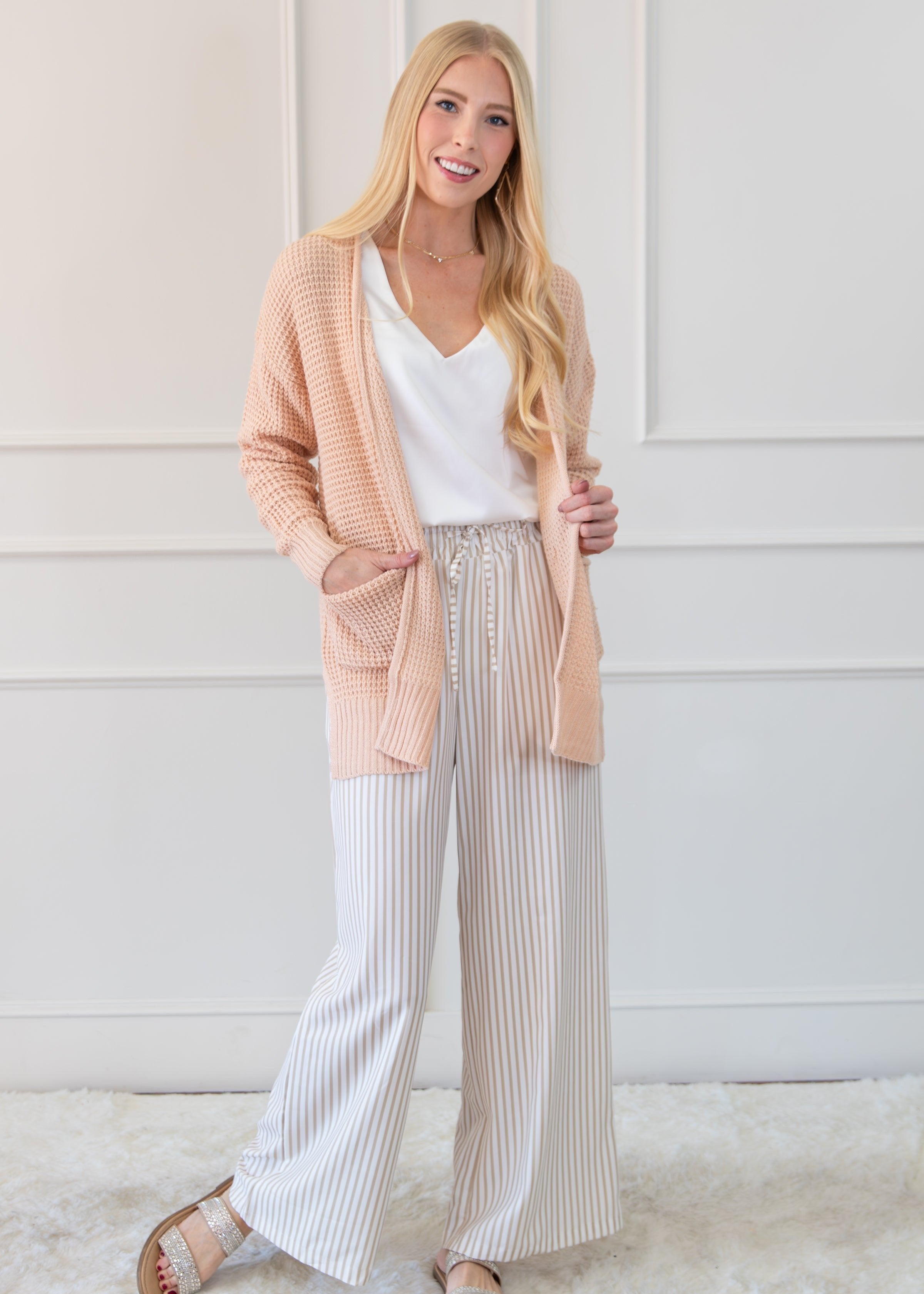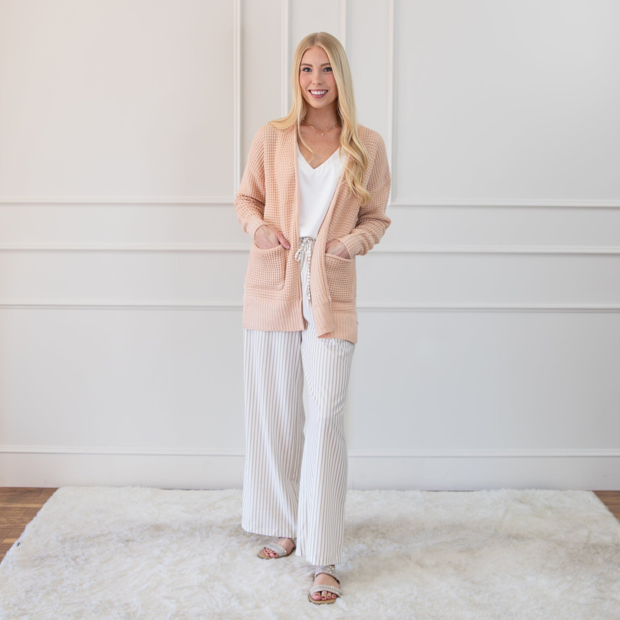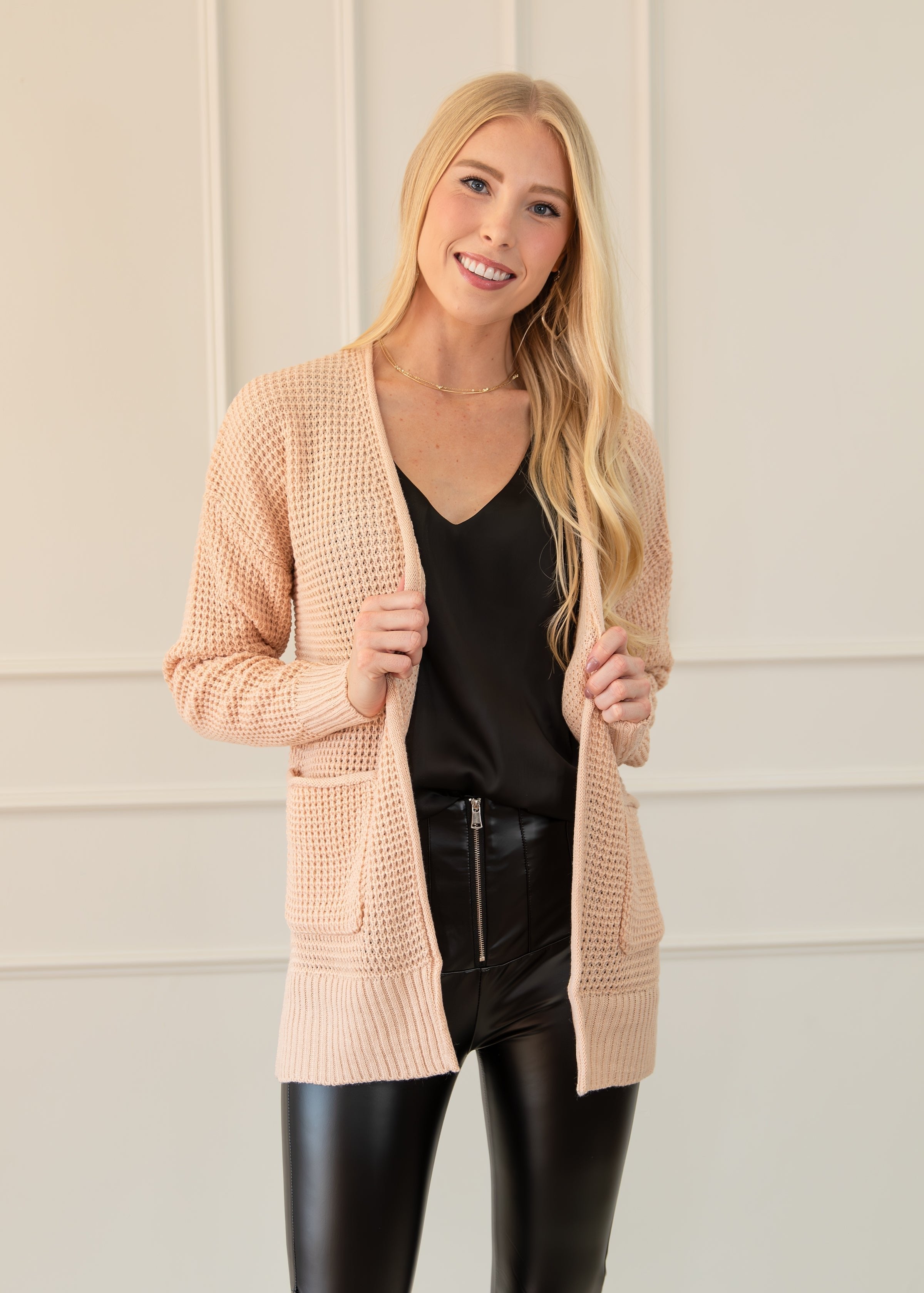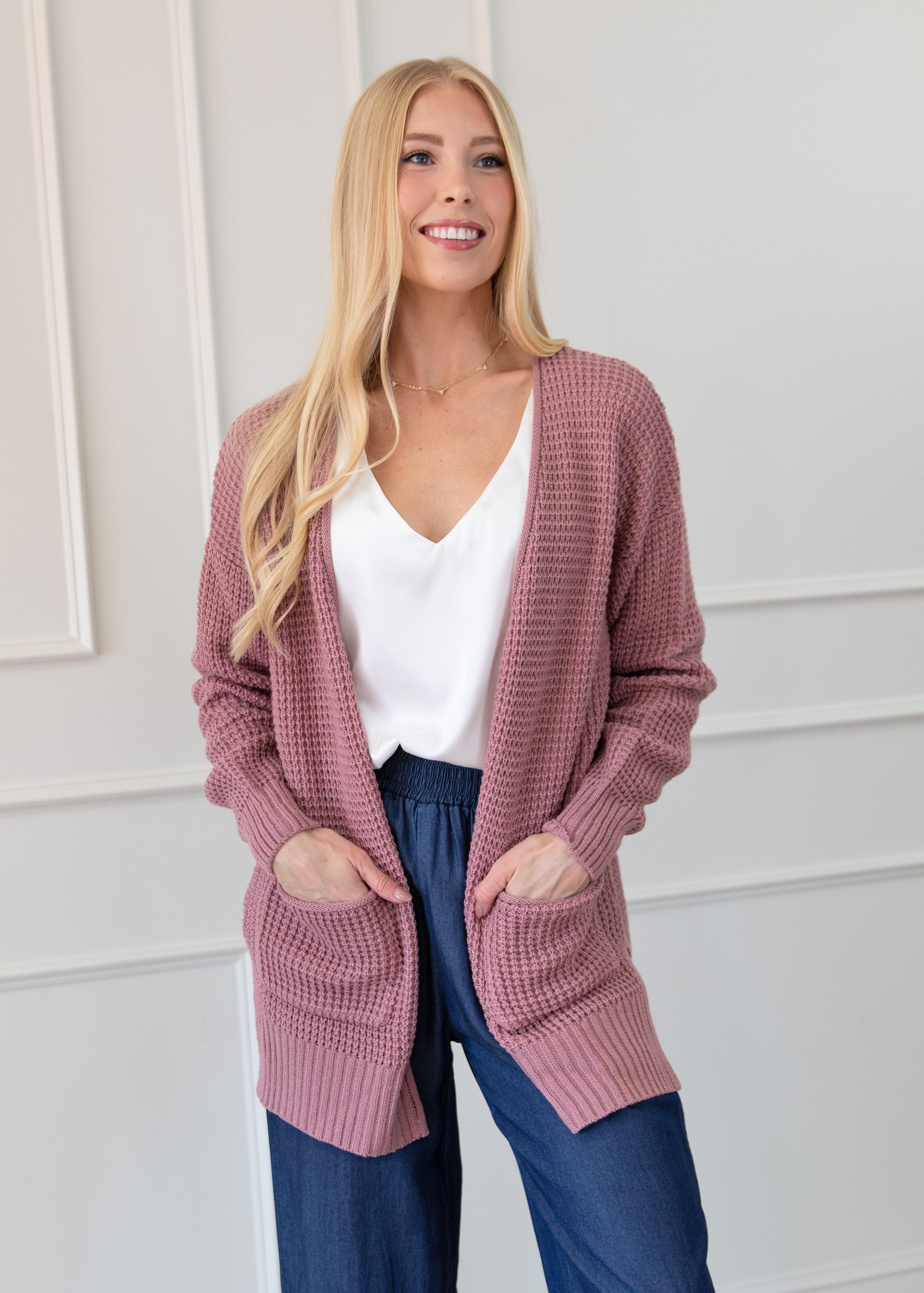 Stay cozy and look stunning in this cozy cardigan. It features a loose fit, waffle pattern, side slits and pockets. Whether you're looking for a stylish addition to your winter wardrobe, or just want something comfortable to layer with, this cardigan is the perfect choice!
